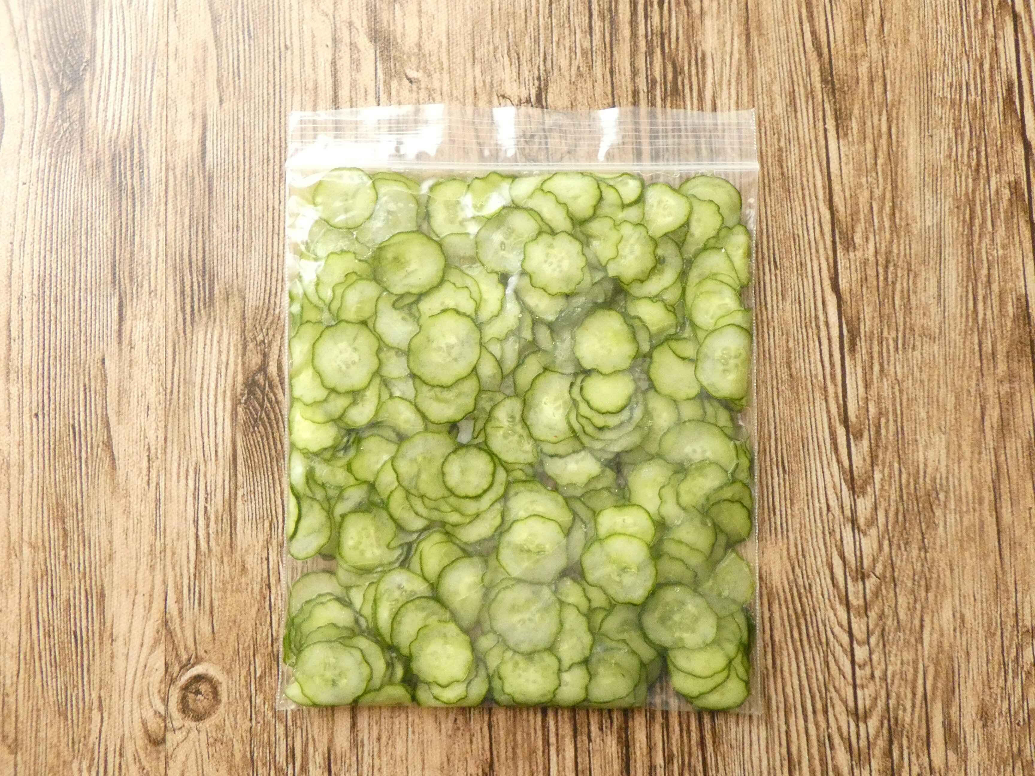 あとはジッパー付きの袋に入れて平らにし冷凍保存するだけですが、このときに塩もみで出た水分を一緒に冷凍するのがポイント。液体と一緒に冷凍すると乾燥が防げるので美味しく食べられます。