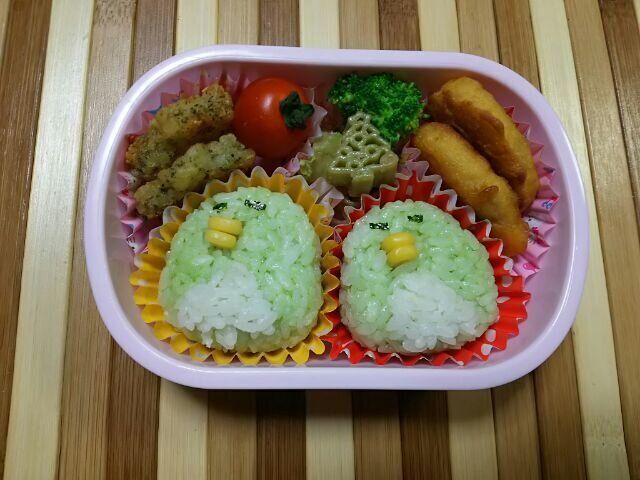 頑張って可愛くしようとしている節は見られますが、私には映えるものを作るセンスが皆無なので本当にただの自己満足なお弁当です。この鳥はいったい何だろう…と今では疑問に思ってしまいますが、当時子どもが喜んでくれていたことが救いです…。