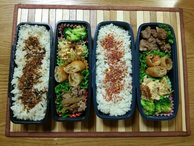 最近、第三子に作ったお弁当です。とても食べ盛りで、かつ体を動かす授業が普通科よりも多い学校に通っています。本人に聞いたらお弁当だけでは足りないということでお弁当+おにぎり等を持っていくことが多いです。おかずも野菜少なめ肉多めですね。