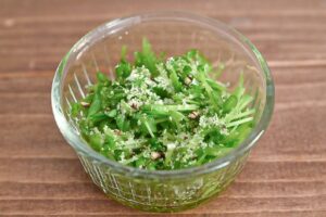(2)豆苗にオリーブオイル、レモン汁を和える。
