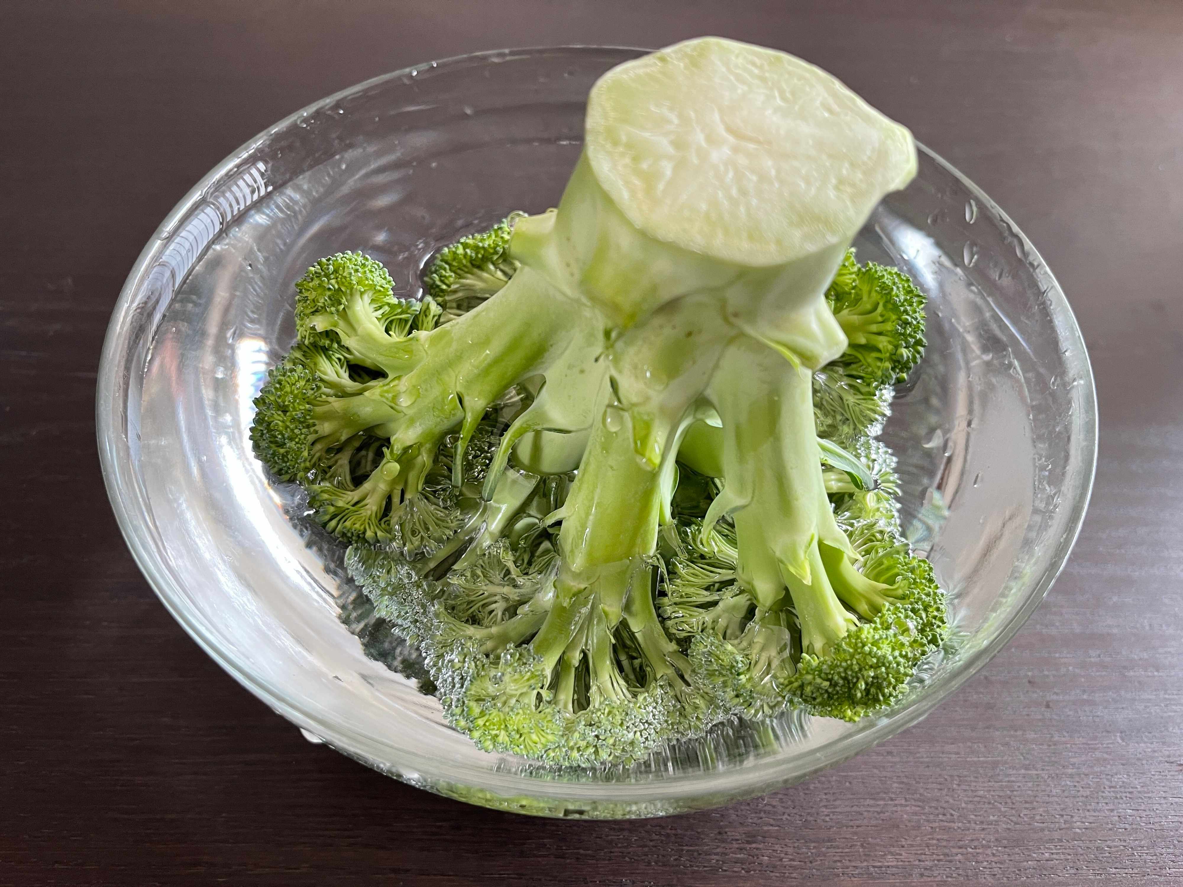 (1)ボウルにたっぷりのお水をため、ブロッコリーの花の部分を下にして入れ、10分程度放置する。