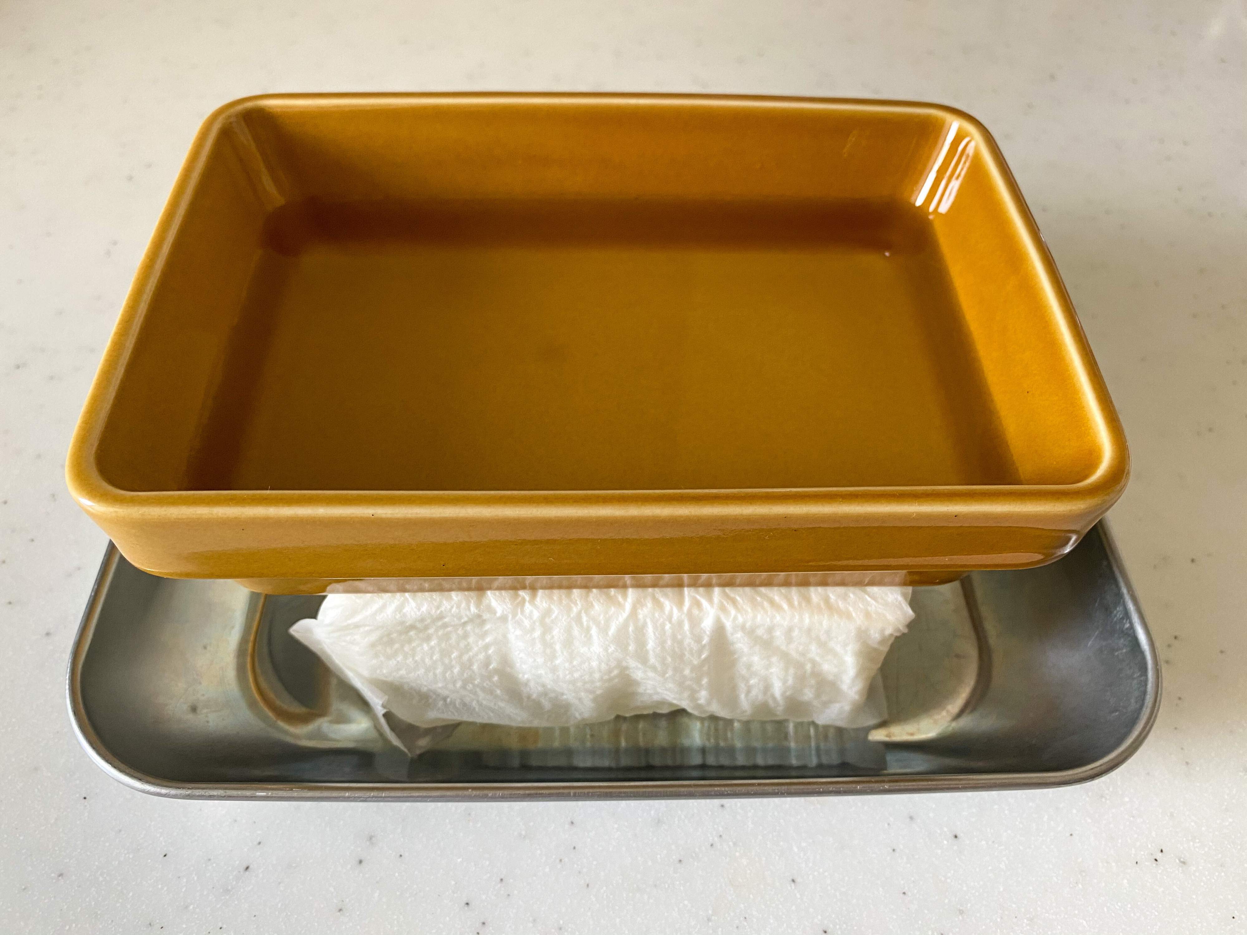 (1) 木綿豆腐1丁をキッチンペーパー2枚に包み、バットにおき、重石をのせて2〜3時間置く。