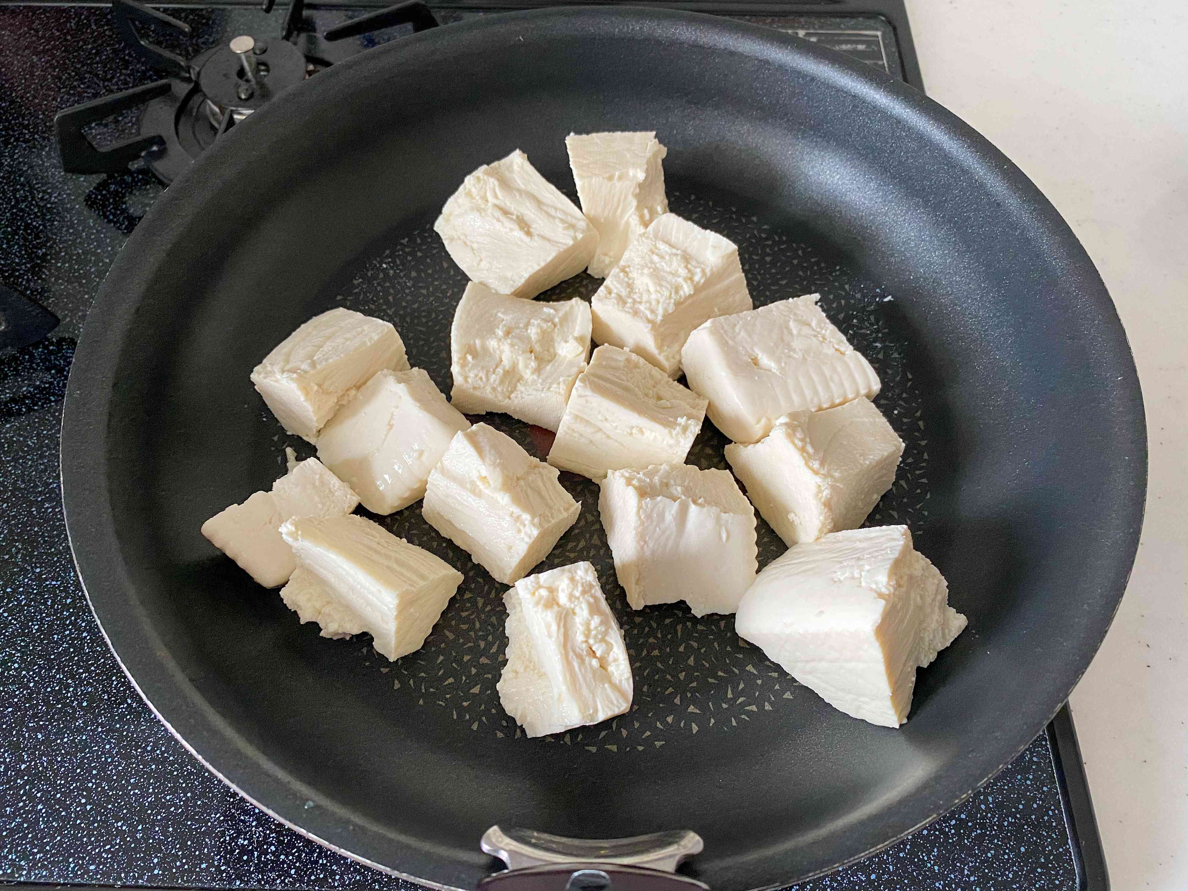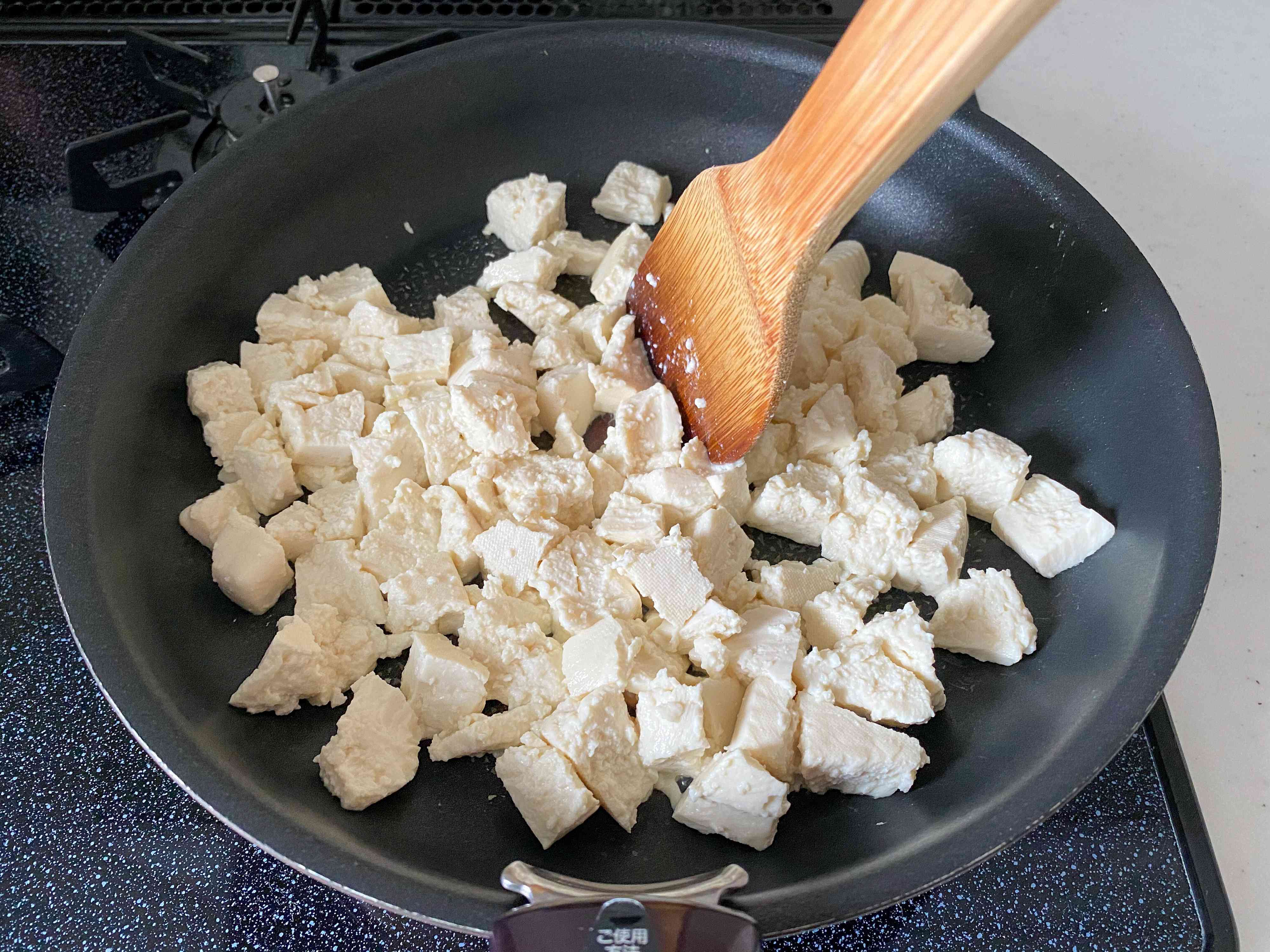 (2) 水切りした木綿豆腐は適当な大きさに手で割り、フライパンに入れて中火にかける。