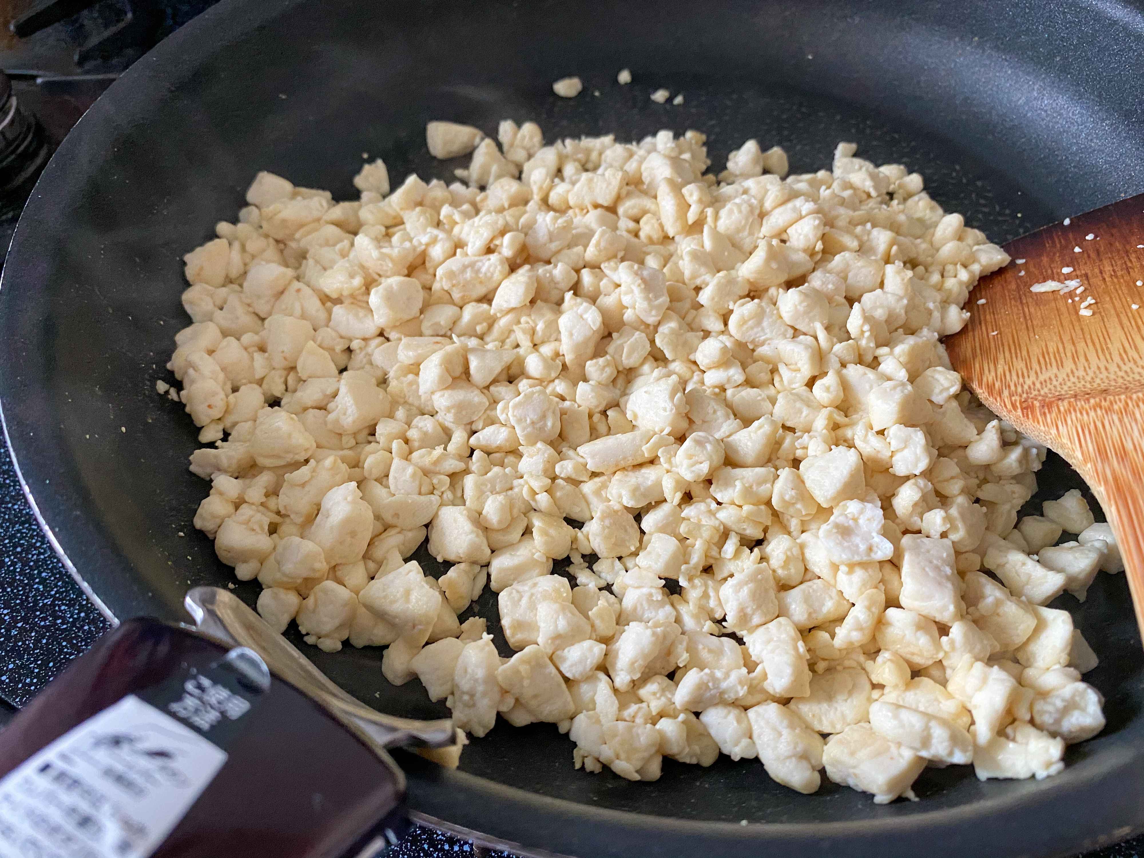 豆腐を炒めて作った大豆ミートは、元の豆腐の重量の約1/2量になります。