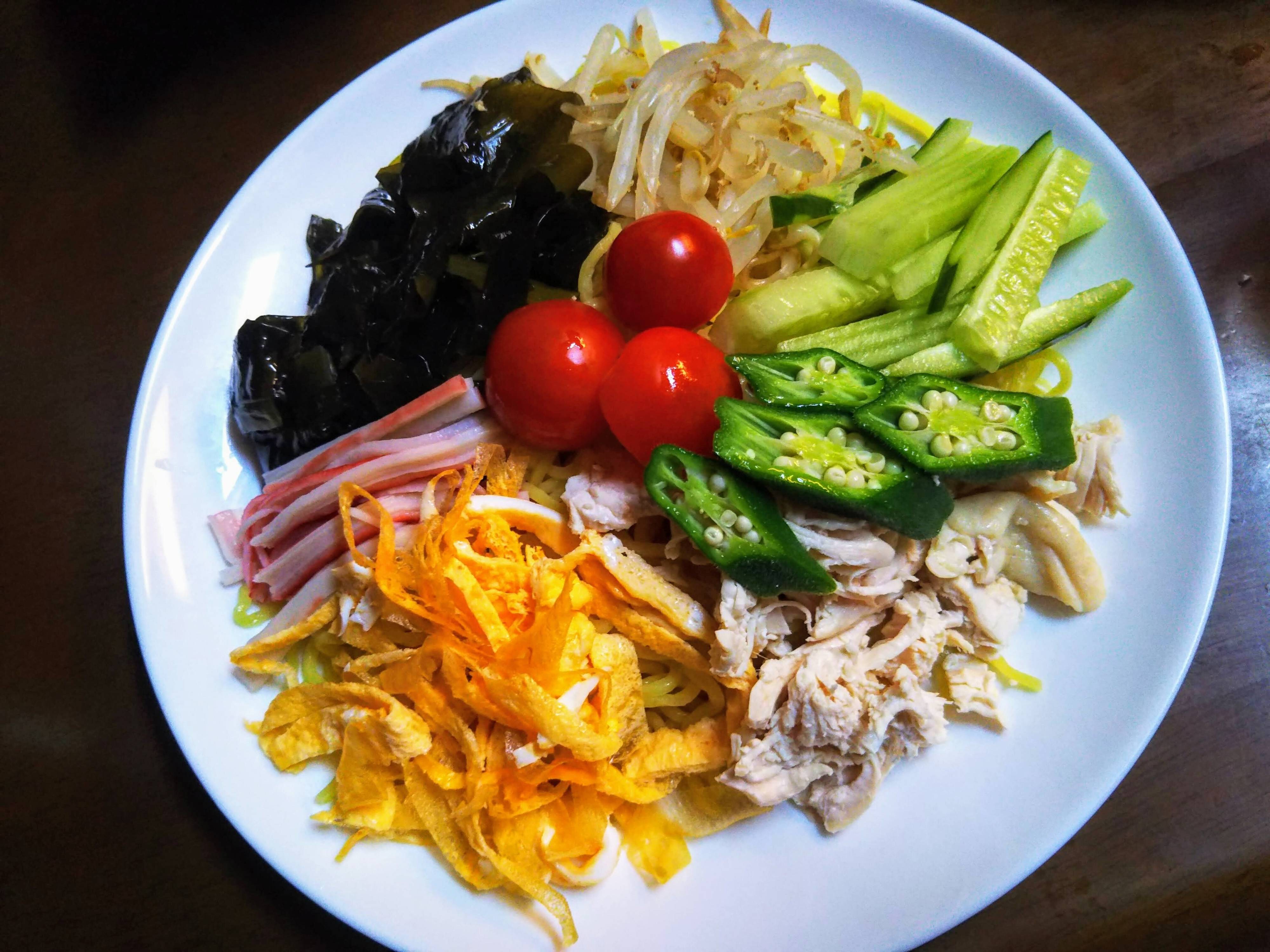 「冷やし中華」の具材としてよく見る組み合わせには、ハム、卵、きゅうり、トマト、わかめがあり、タンパク源・野菜・海藻などと幅広い種類が使われるので、一皿でもバランスを整えやすい料理といえます。