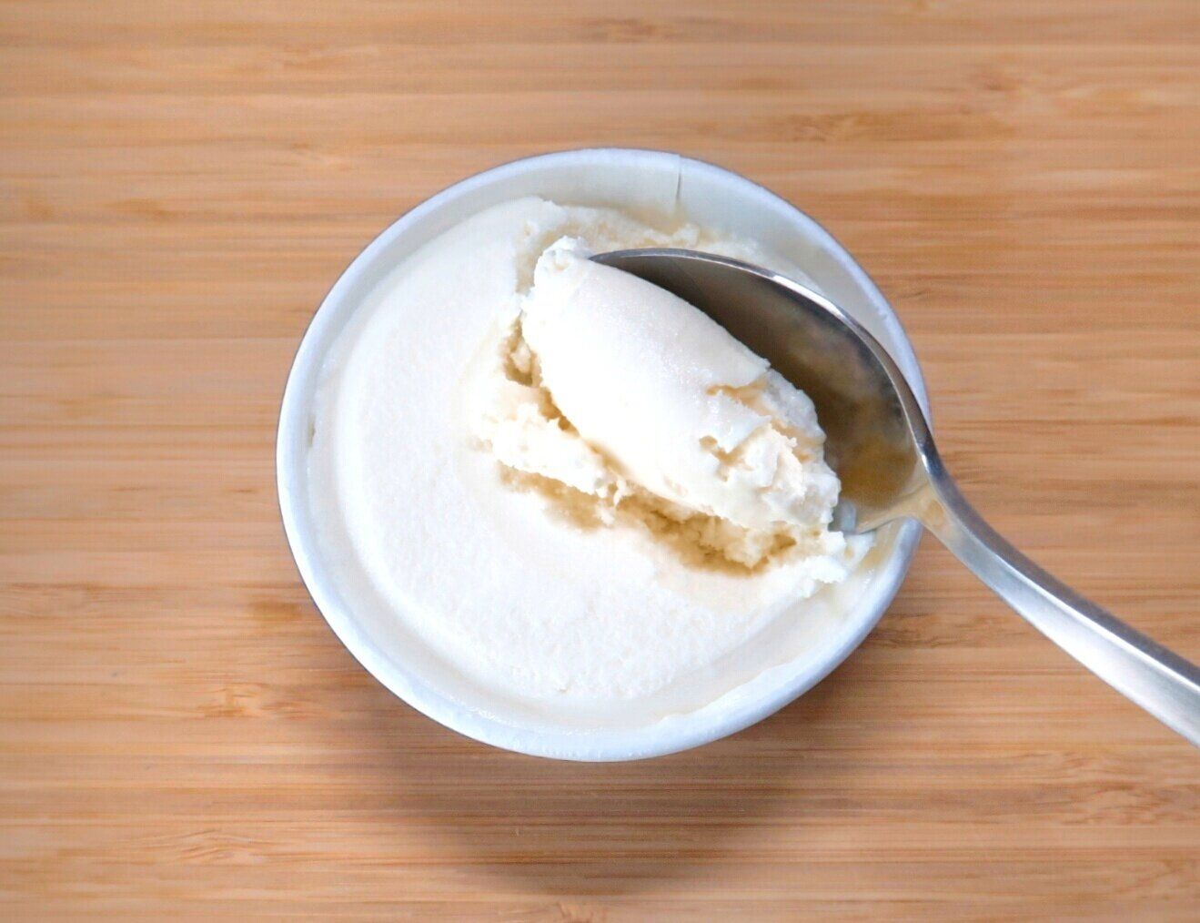 アイスを冷凍庫から出し、常温に3分ほどおきなめらかにします。スプーンですくえるくらいの固さになればOK!