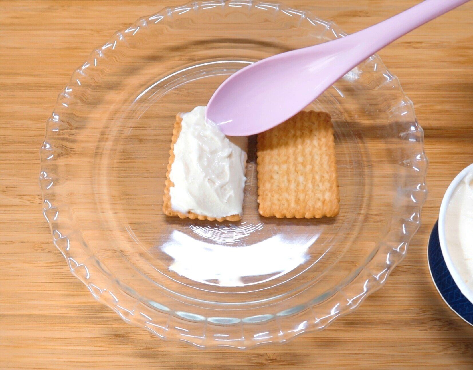 クッキーの裏面を上に向けておき、アイスクリームをスプーンでのせます。角までしっかり塗りひろげるときれいな仕上がりになります。バニラ、抹茶など2種類の味をミックスするのもおすすめ◎!
