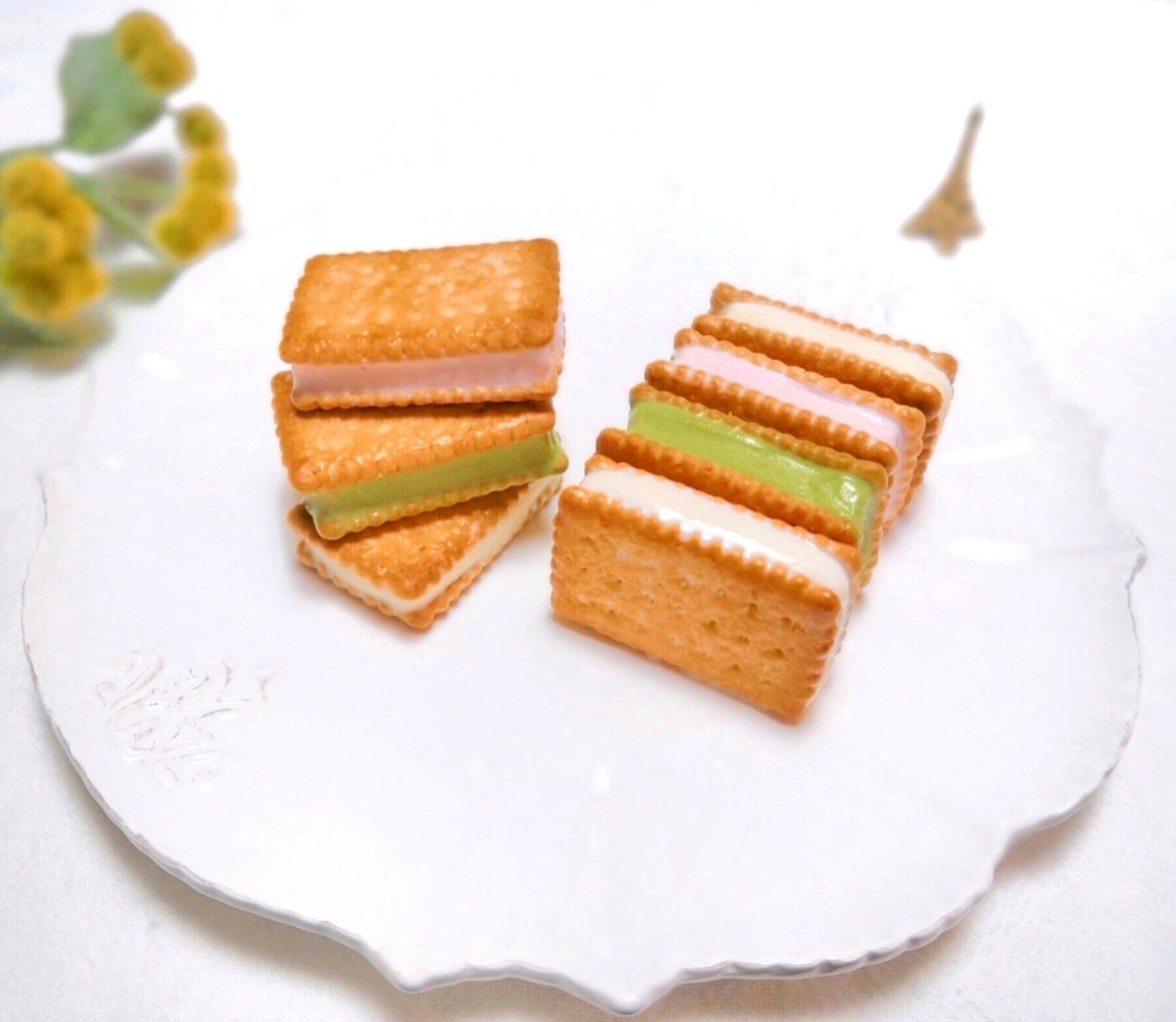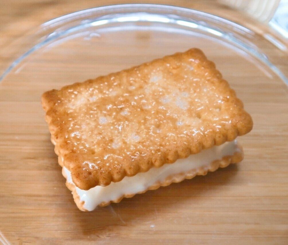 冷凍庫から取り出せば、クッキーサンドアイスの完成です!市販のクッキーやビスケットに含まれる少量の塩が、アイスの風味をより引き立ててくれます。
