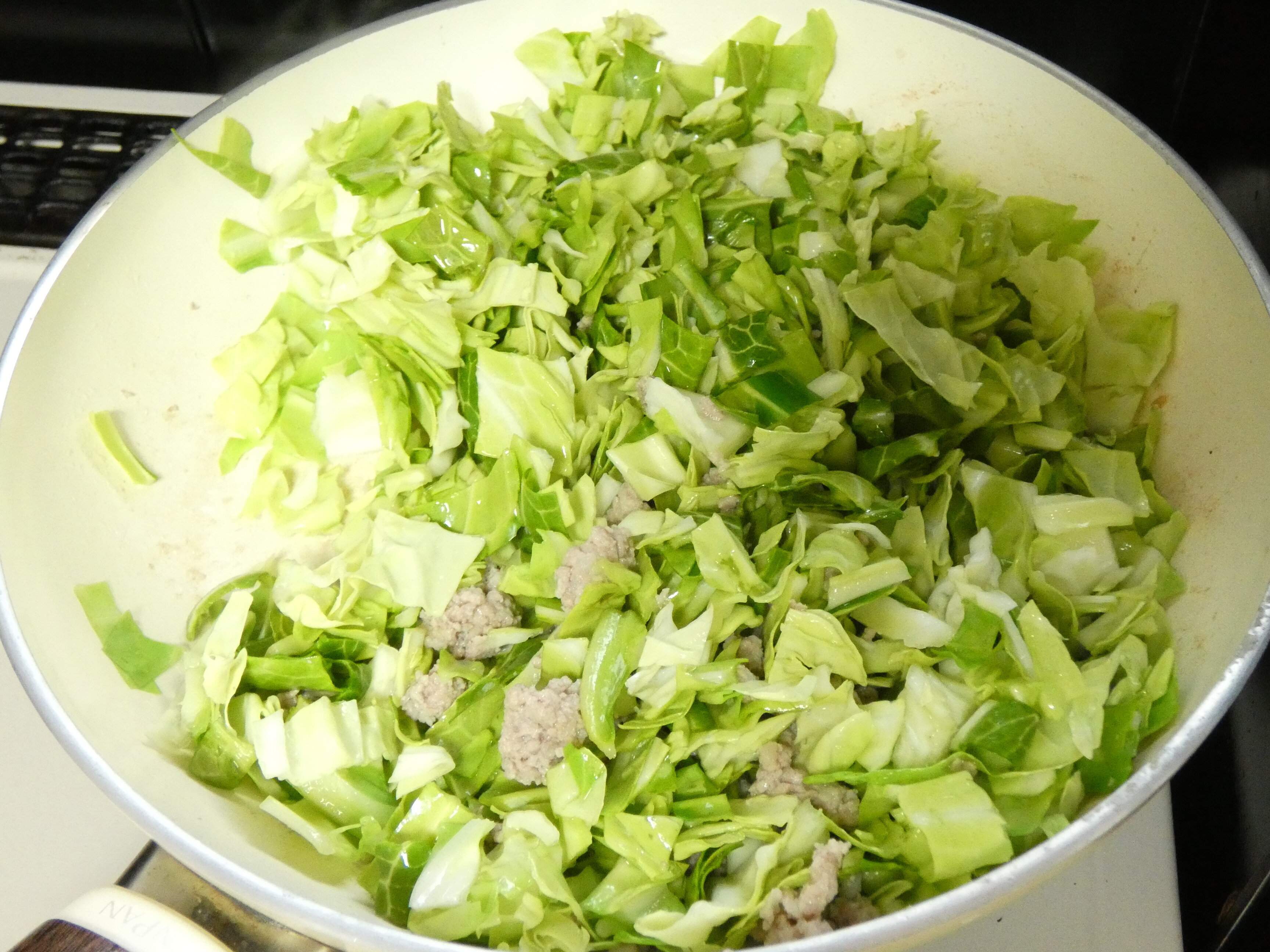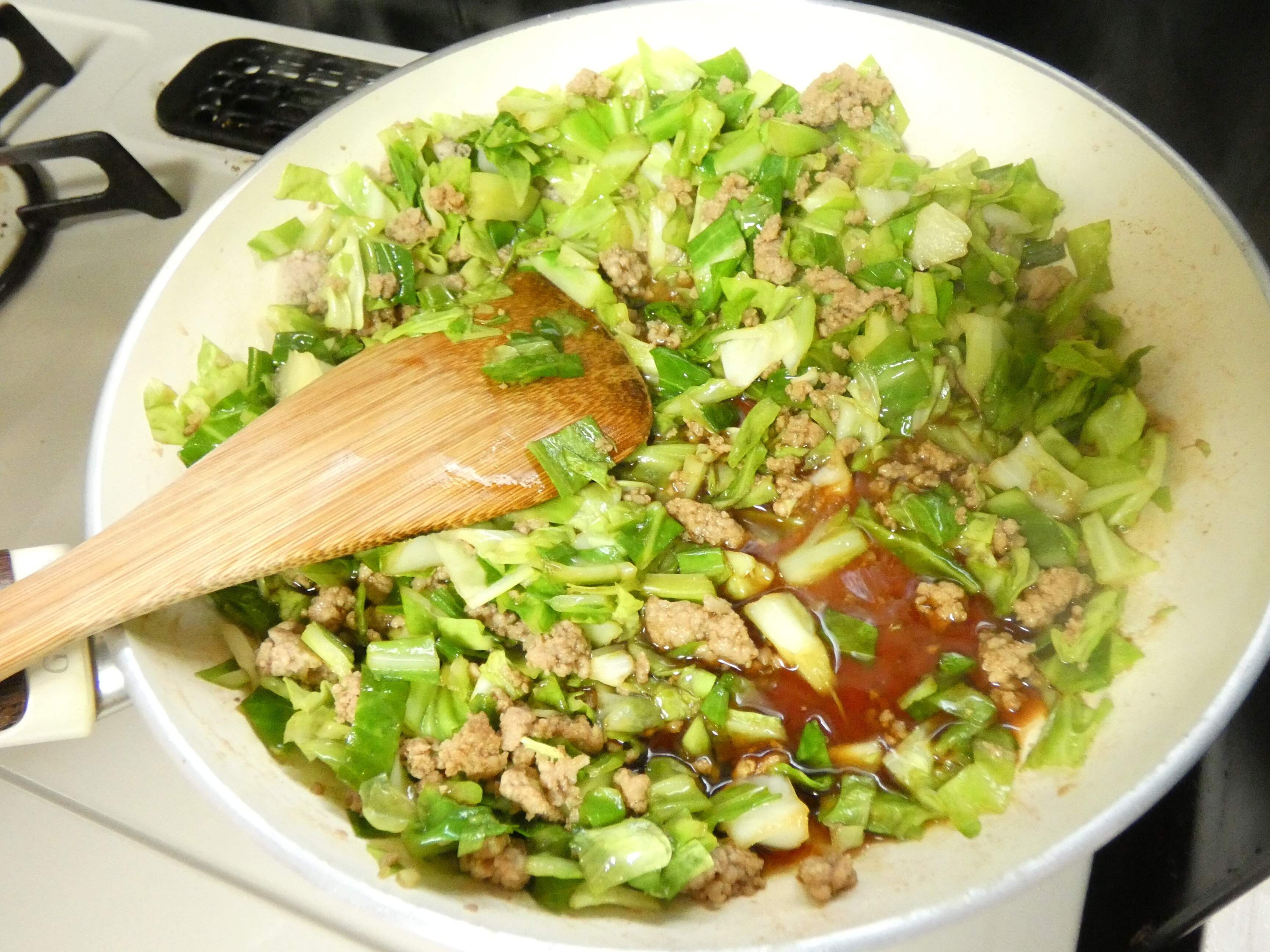 2.フライパンに油とひき肉を入れて炒め、ひき肉の色が変わってきたらキャベツを入れます。