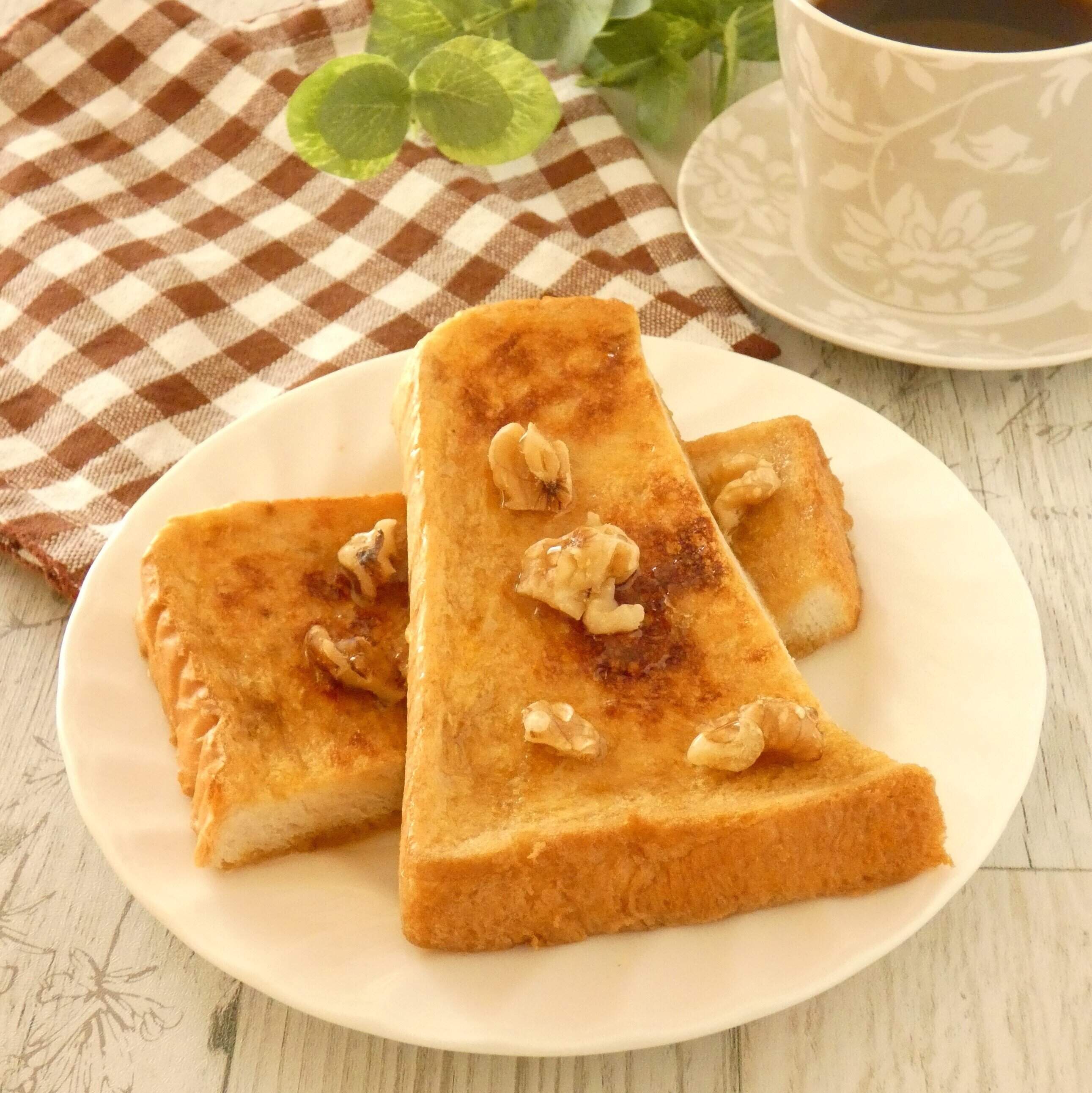 卵液を作るときにインスタントコーヒーや抹茶を混ぜ合わせたり、焼き上がった後にフルーツや蜂蜜、ナッツ類などお好みの物をトッピングするとアレンジが楽しめます。