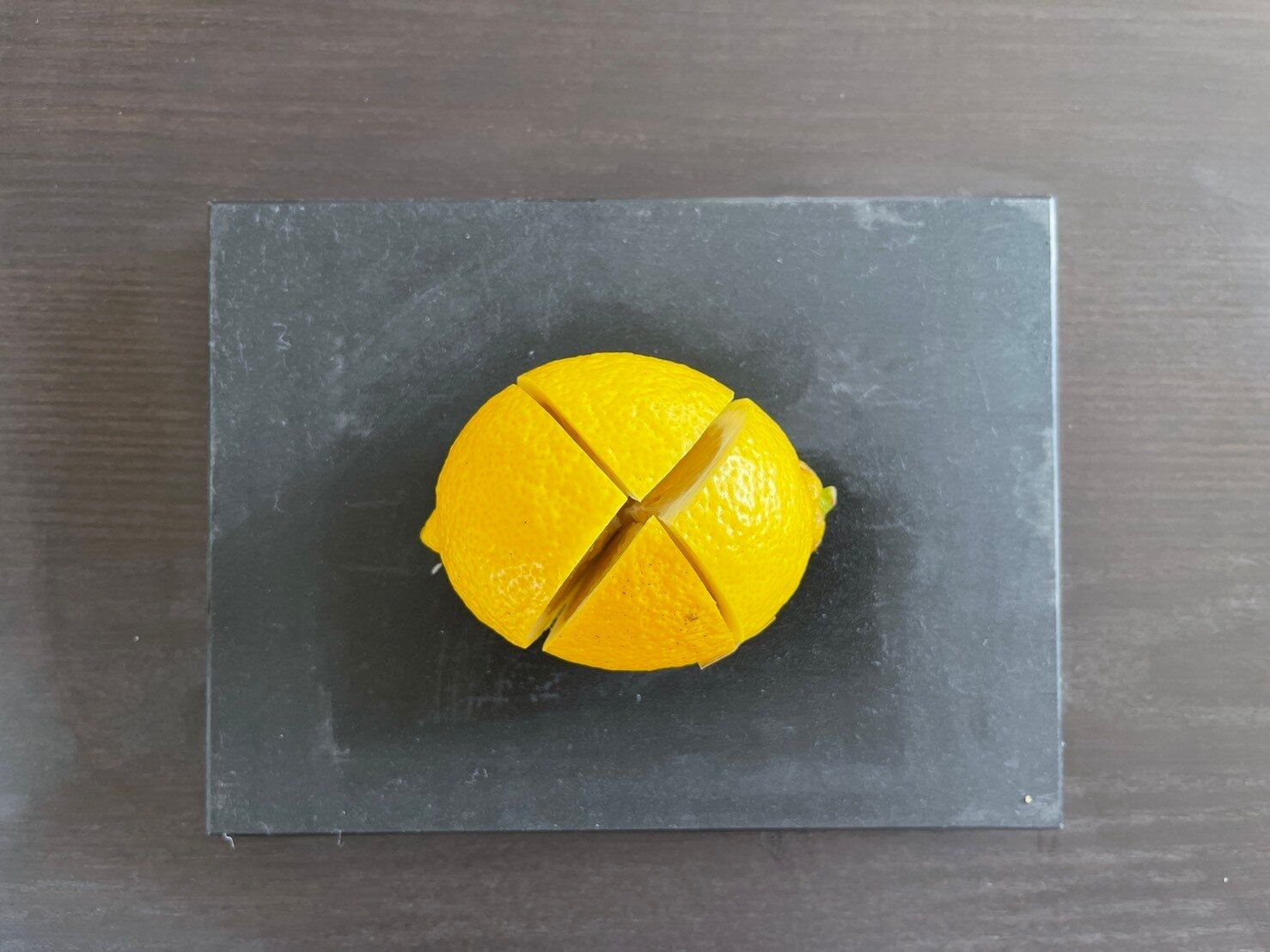 しかし、この切り方では、レモンには薄皮があるのでレモン汁を充分に絞り出すことができません。そこでおススメしたいのが「X」の形に包丁を入れる方法。