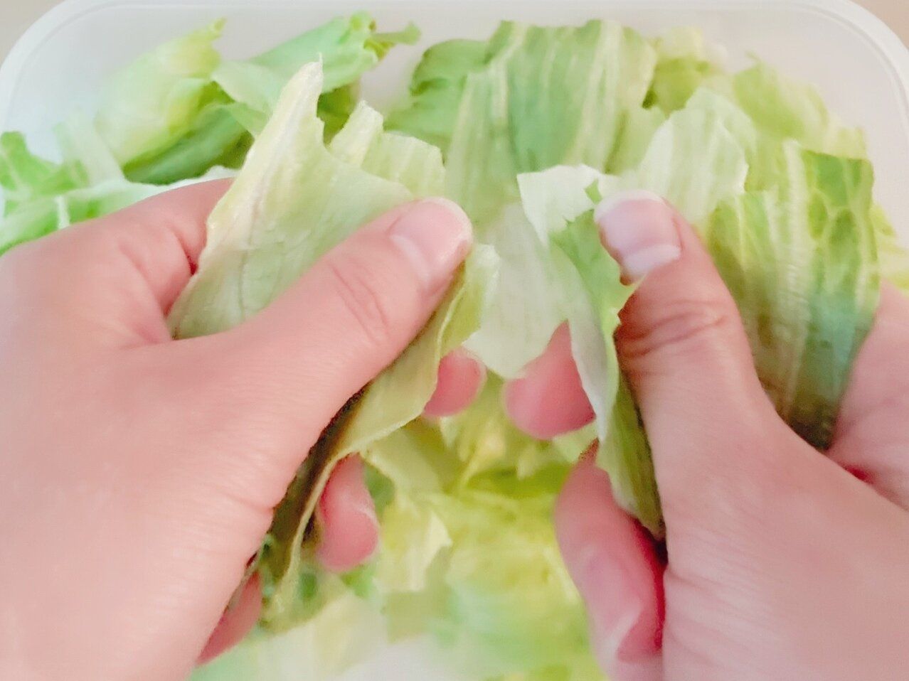 わが家ではこの方法で、買ってきたレタスをすぐに食べやすいサイズにして大きなタッパーに保管しています。そうすることで、毎回洗って準備する手間もなくなるので、朝食のサラダやお肉料理のつけ合わせなどに、パッと使うことができてとても便利です。