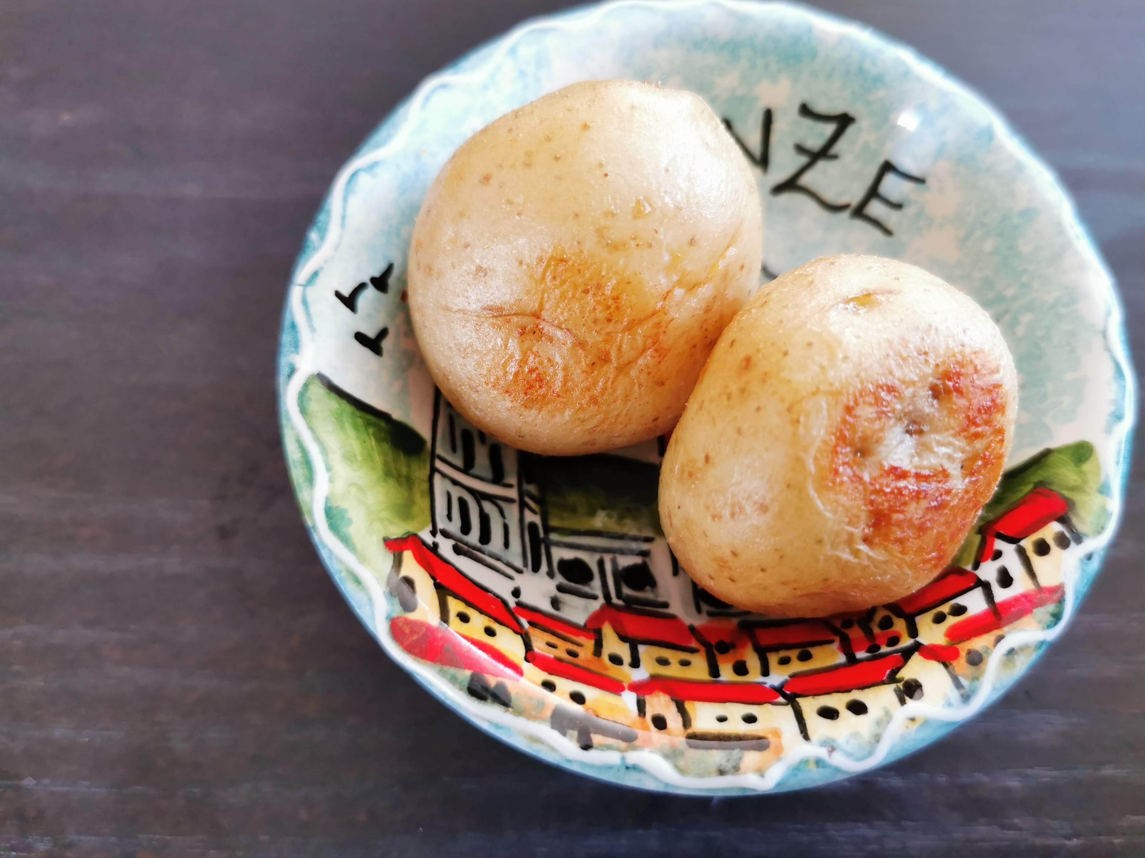 (2)新じゃがは竹串がスッと刺さるまで茹で、半分に切る。