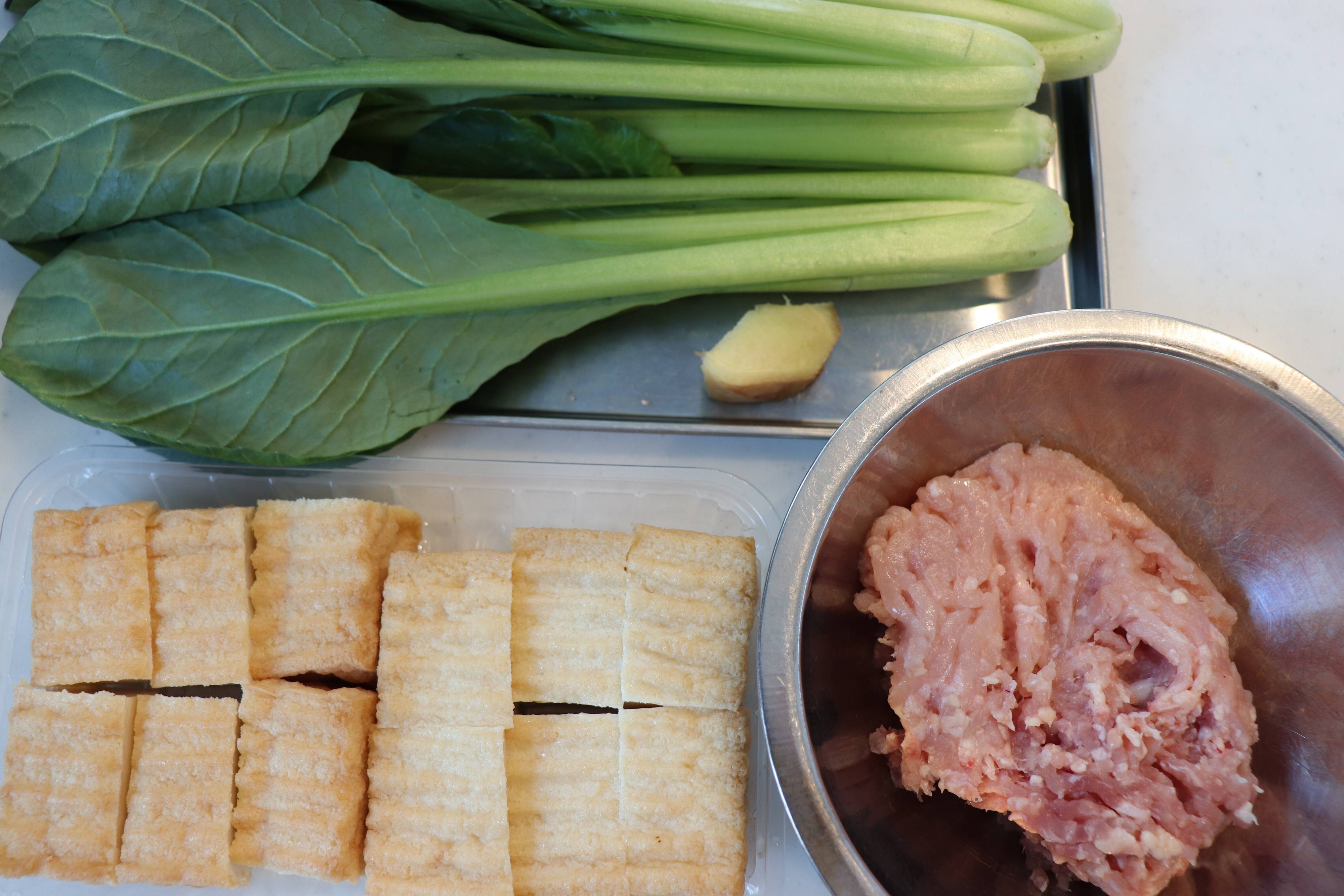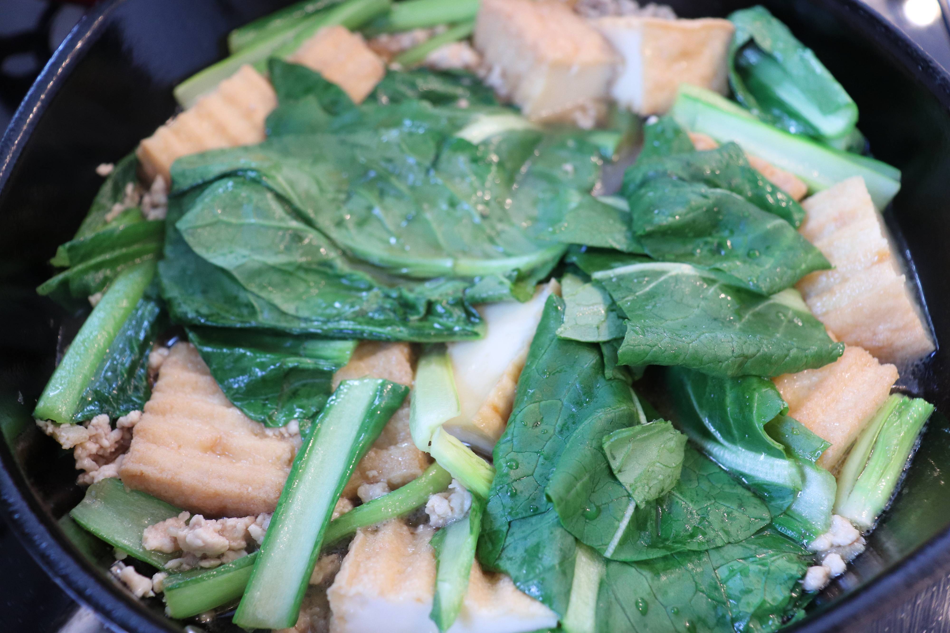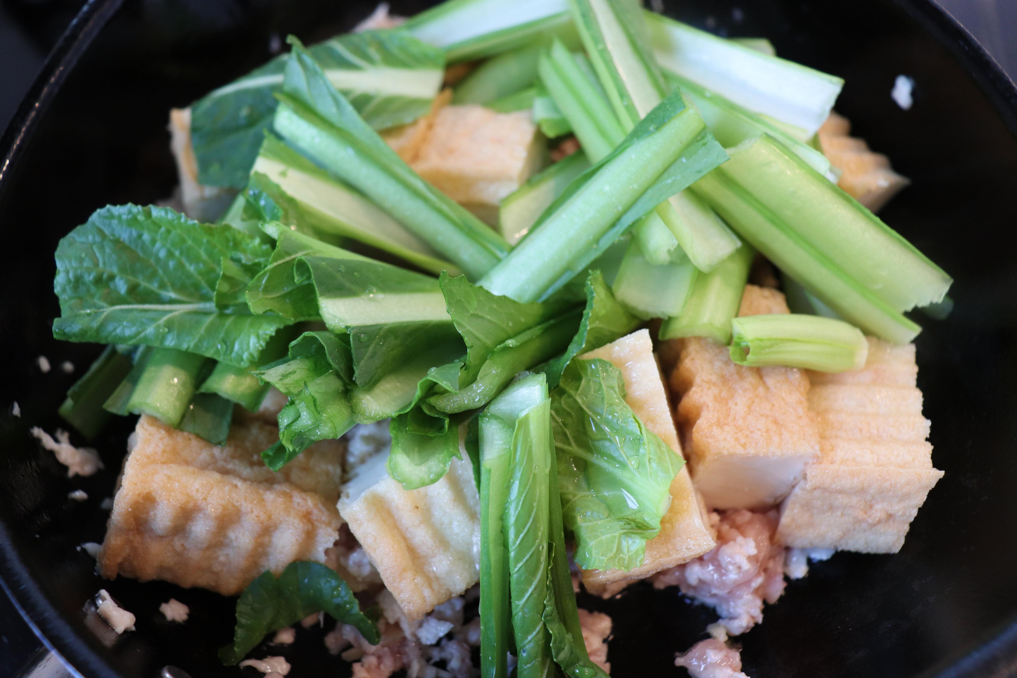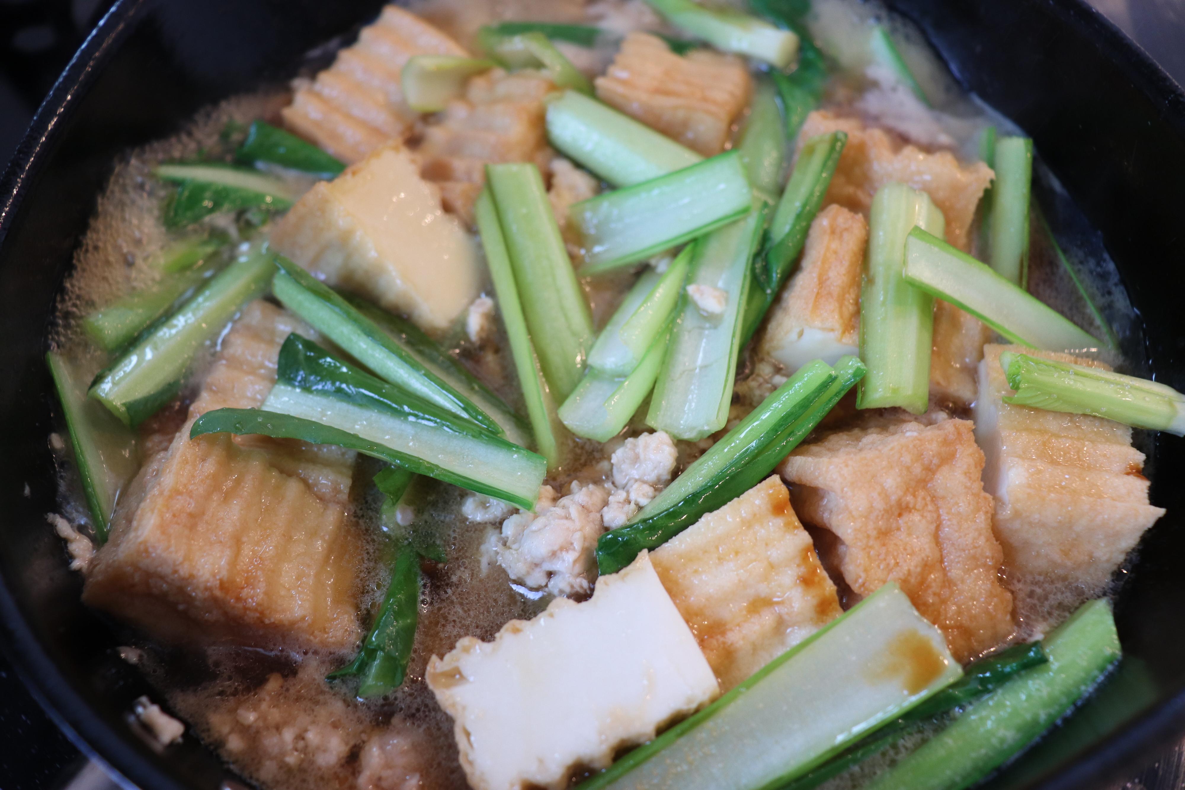 3.ひき肉の色が変わったら、厚揚げと小松菜の茎の部分を加え、Aを入れて中火で約2分煮る。