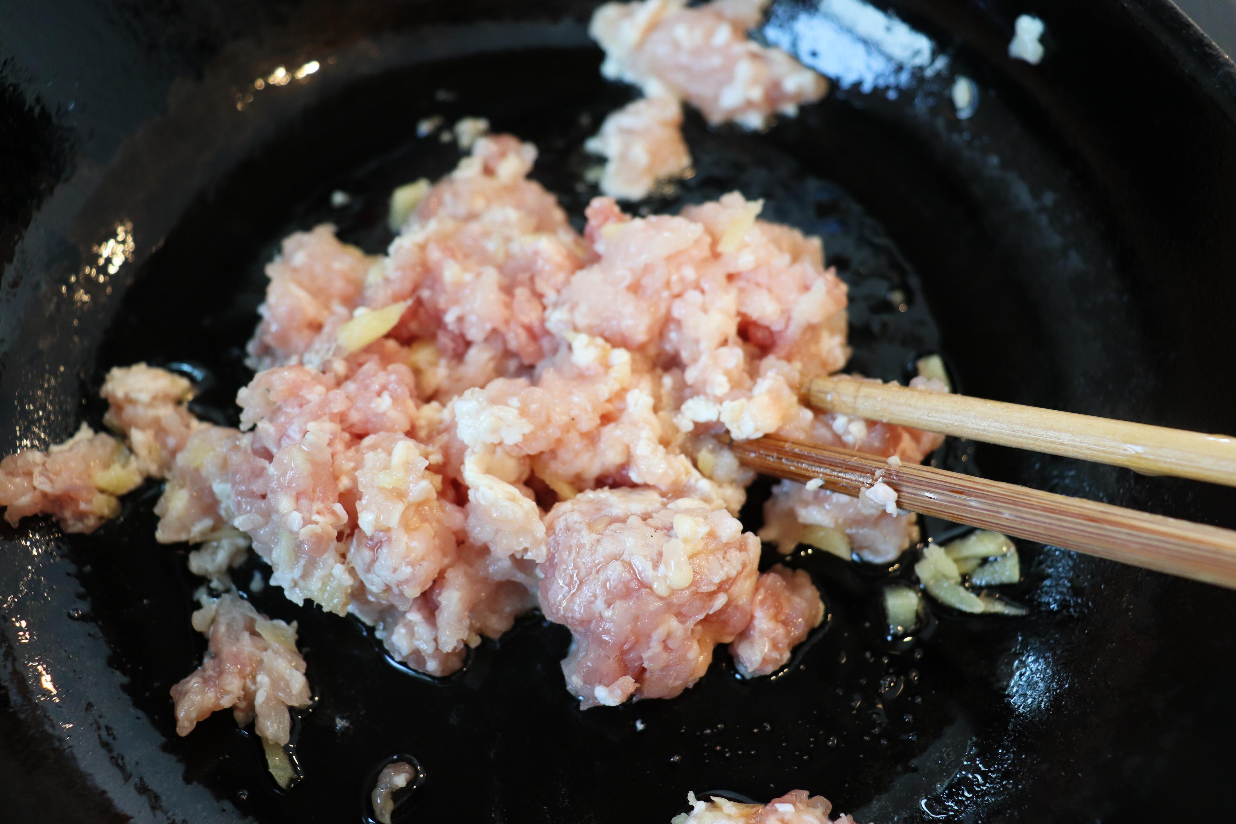 2.フライパンにごま油を入れて、中火でしょうが、ひき肉を炒める。