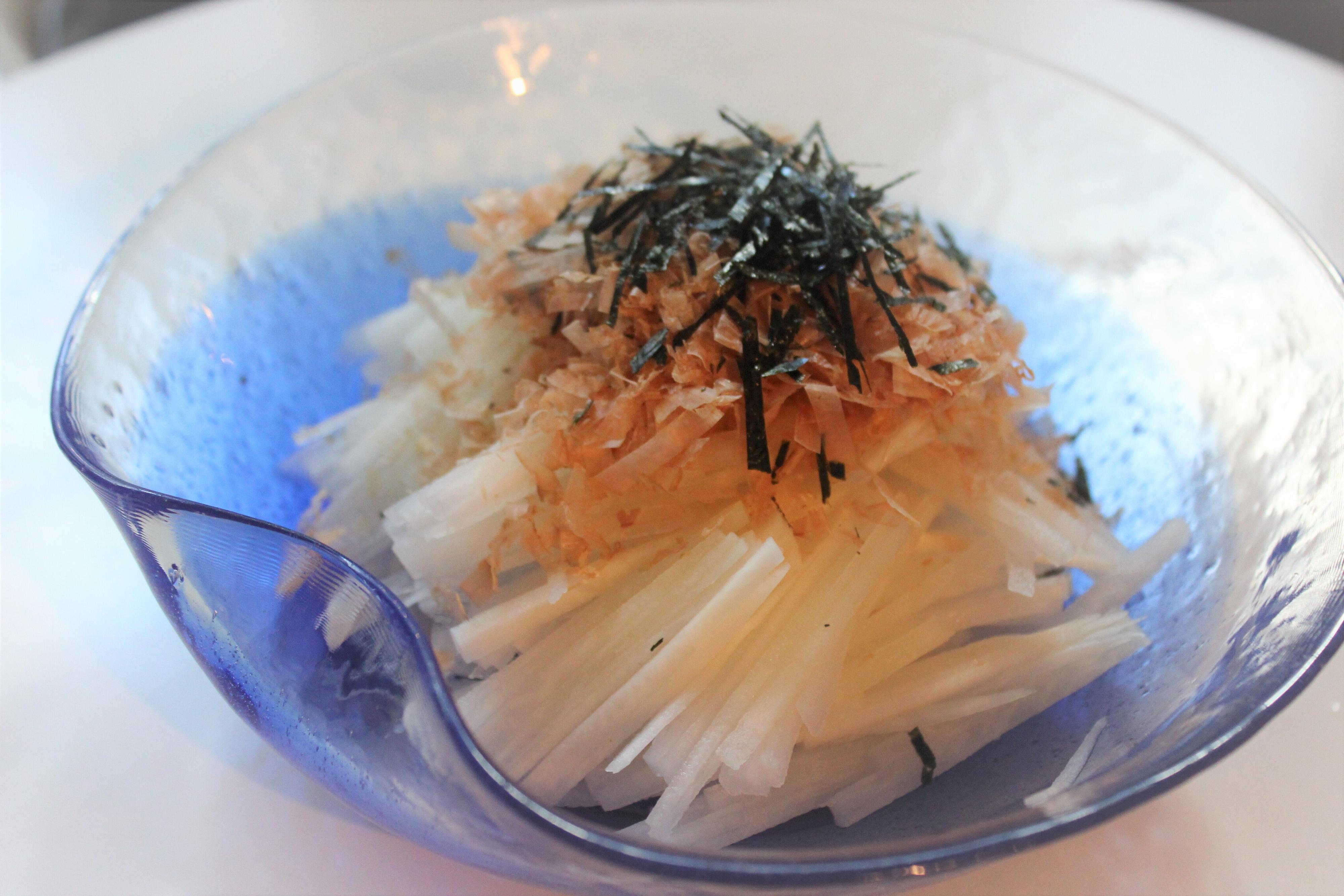 大根を薄い輪切りにしてから千切りにすると、ふんわり柔らかい食感の千切りに仕上がります。パリパリとしたサラダとはまた違うおいしさで、我が家では梅干をつぶしたもの、鰹節と一緒に和え、食べる直前に刻み海苔をかけて食べたりします。