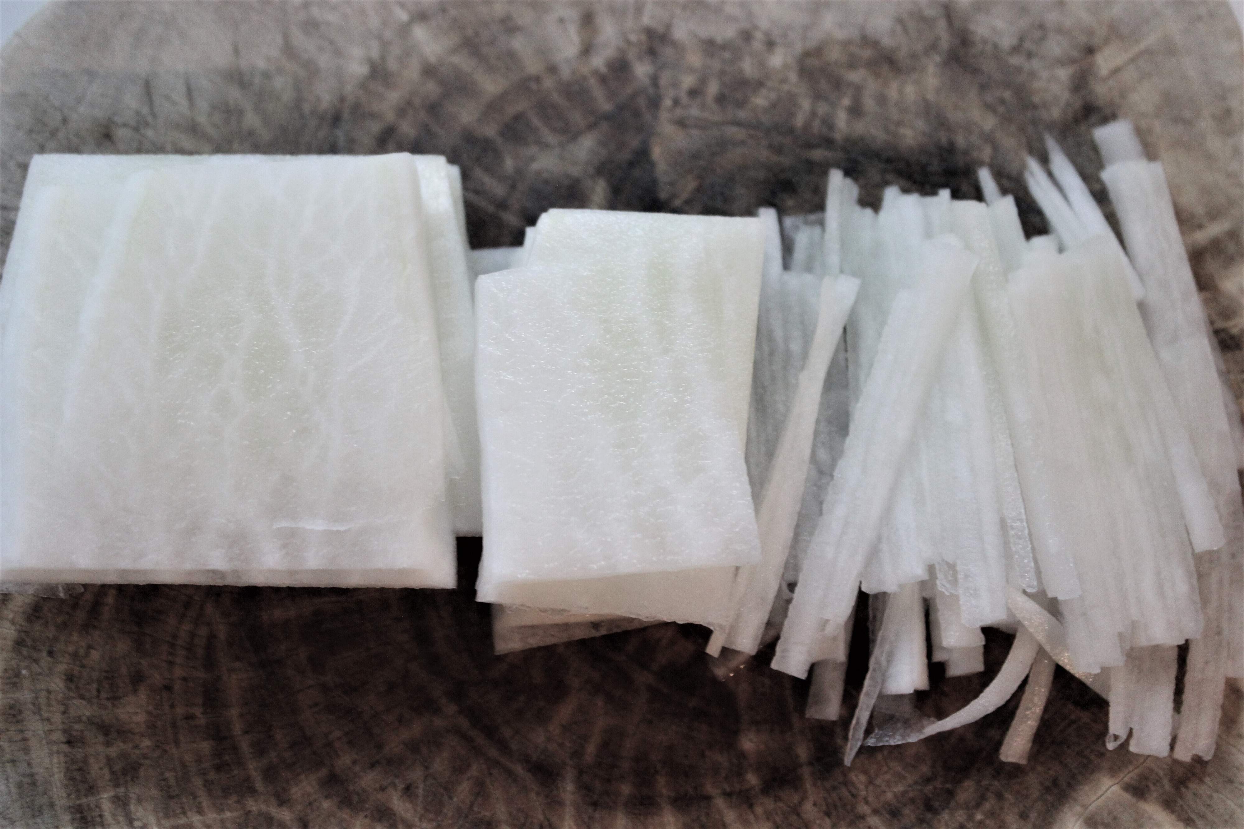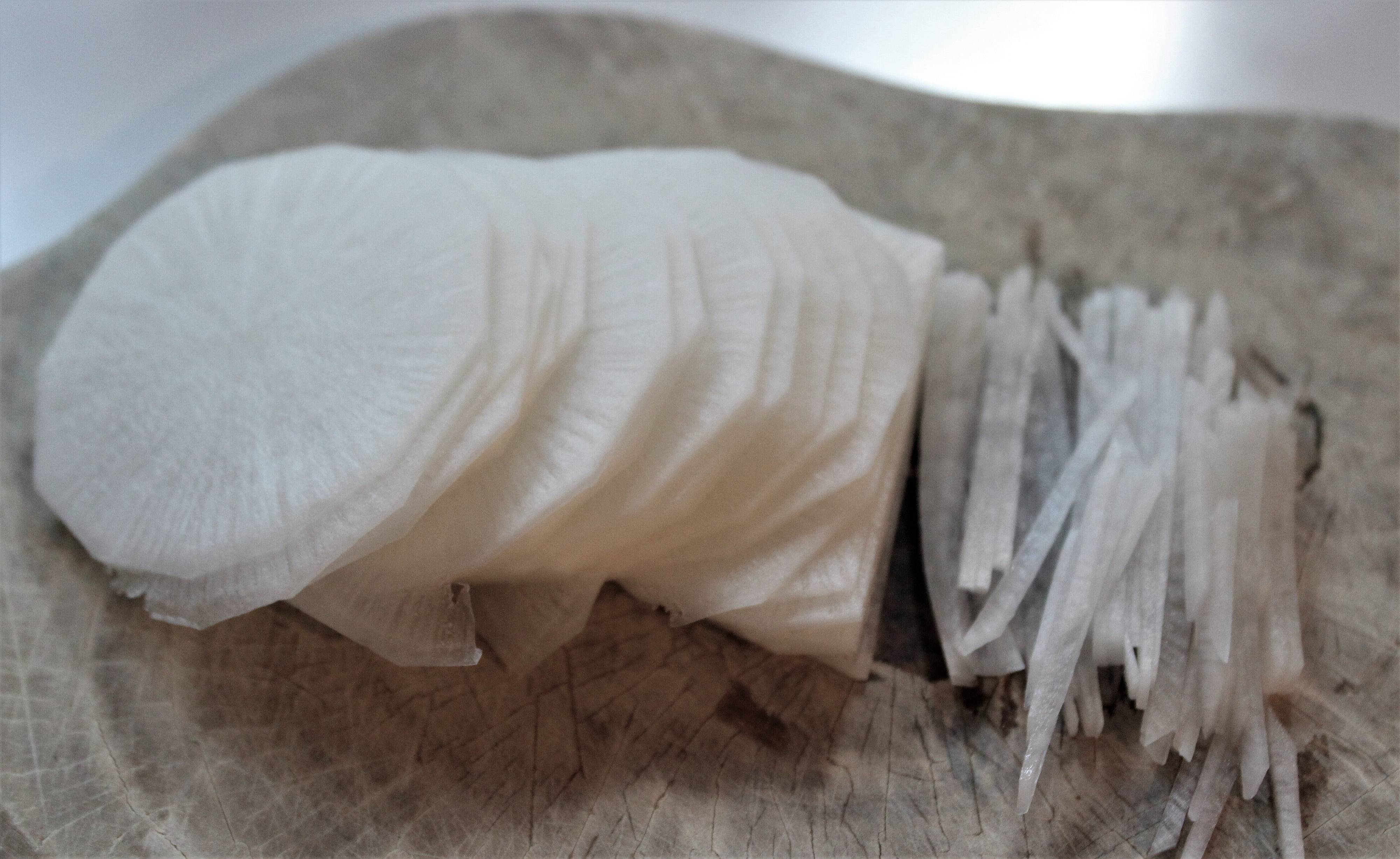 大根を5~6cmの長さに切り、切り口を下にして繊維に沿って薄切りにします。繊維に沿って端から千切りすると、シャキシャキぱりぱりとした歯ごたえの楽しい千切りになります。氷水にしばらく放してから水けを切ると、さらにパリパリ感アップ!