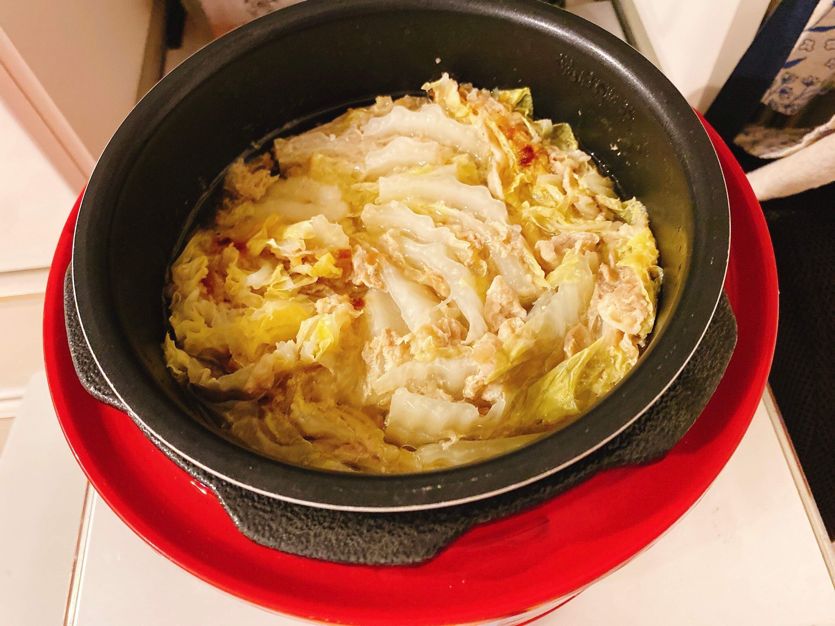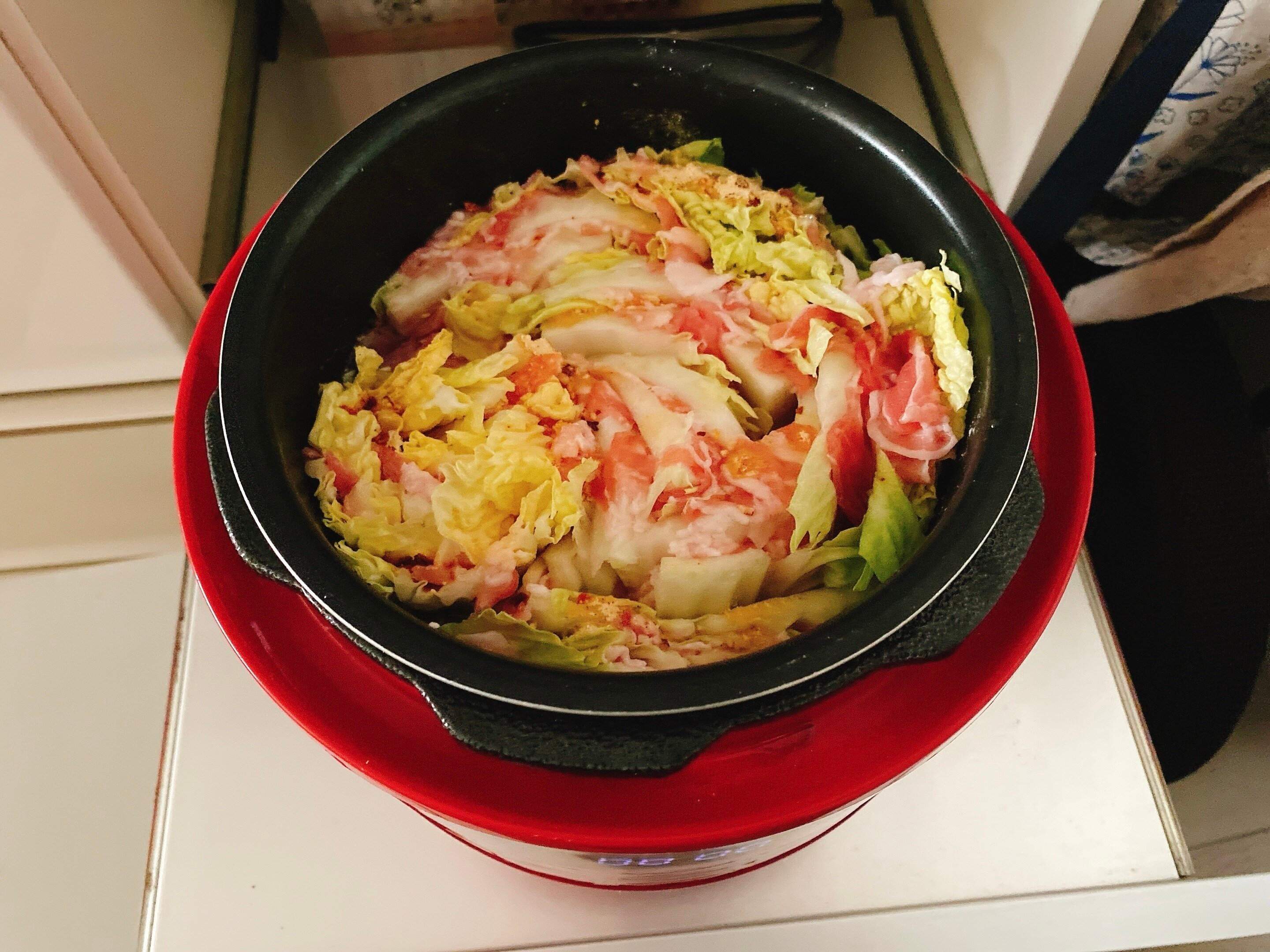 白菜と豚肉をお鍋に詰めたら、あとはスイッチを押すだけで簡単にでき上がります。