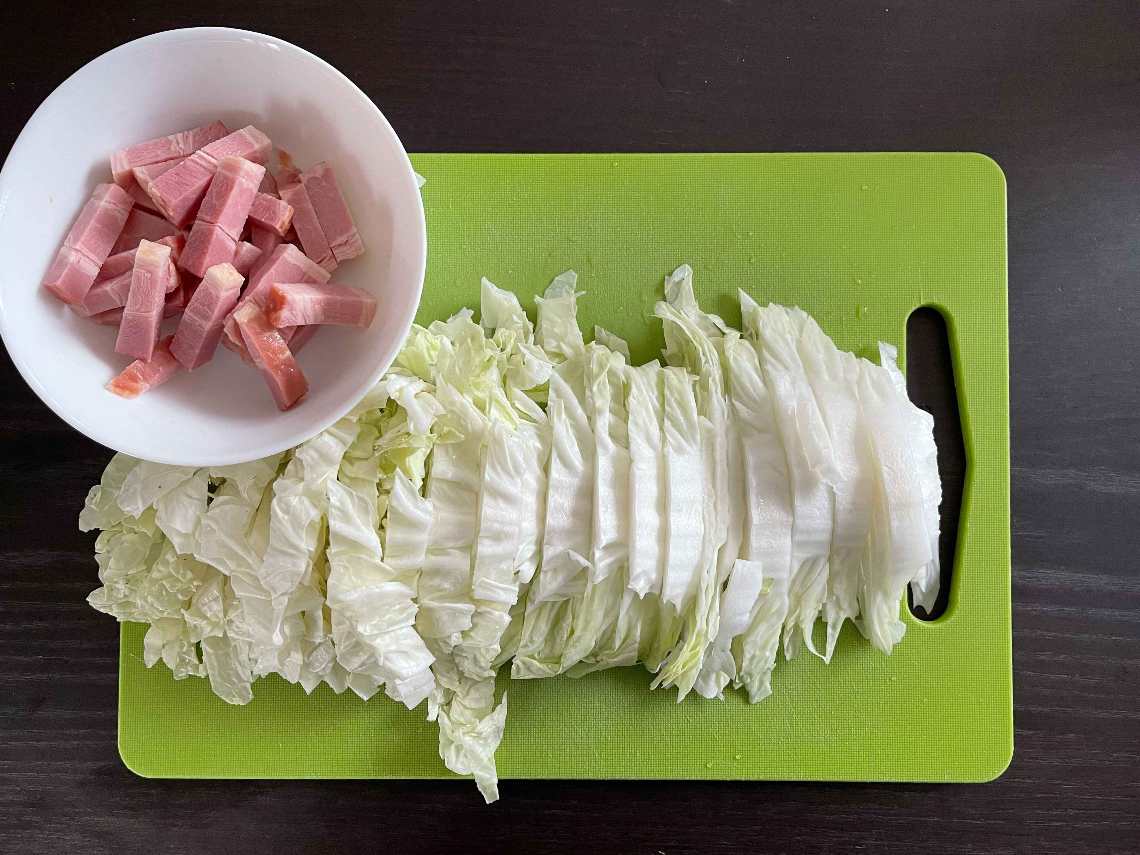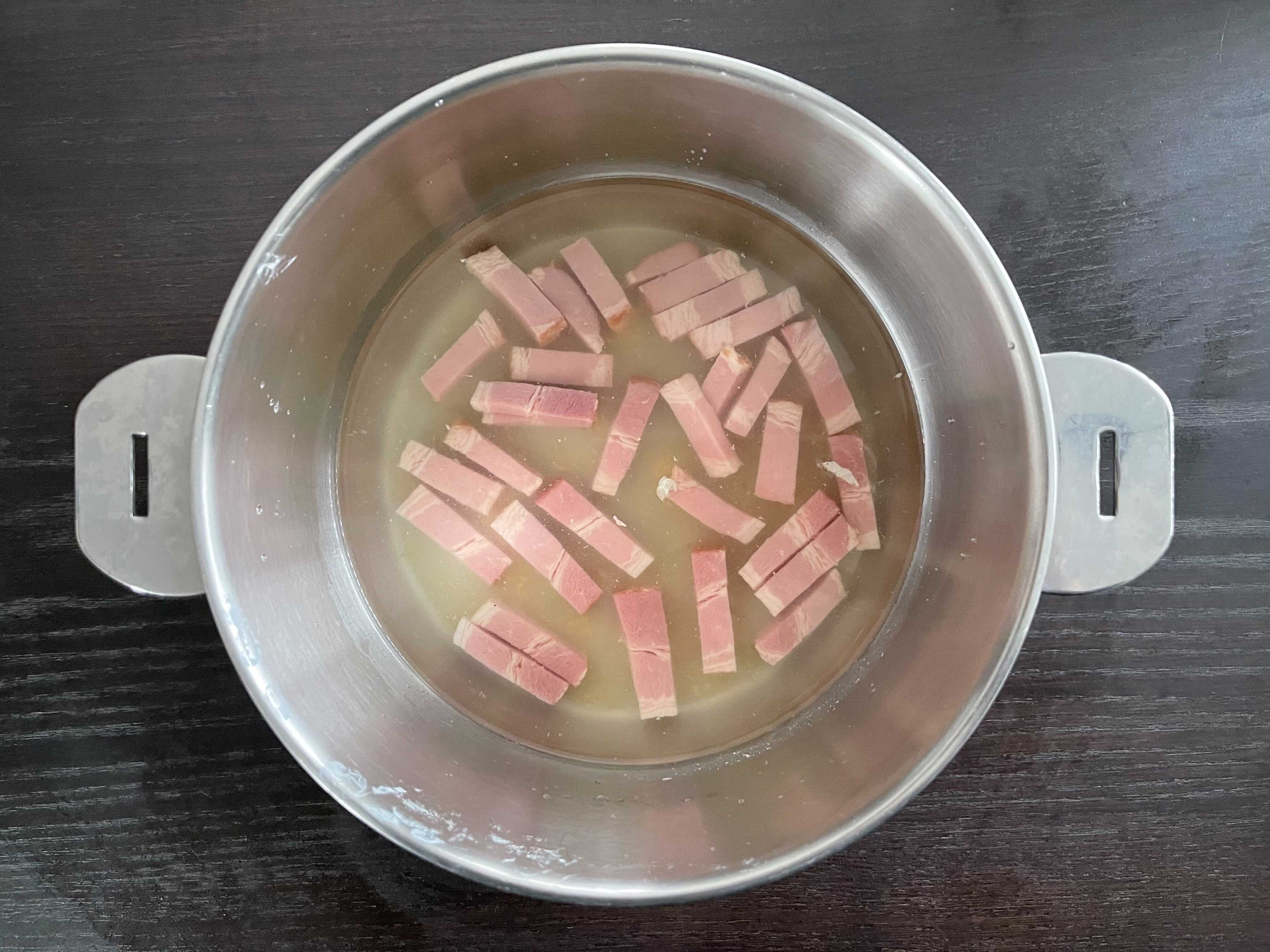 【2】鍋に水と鶏ガラスープの素、ベーコンをあわせて加熱する。