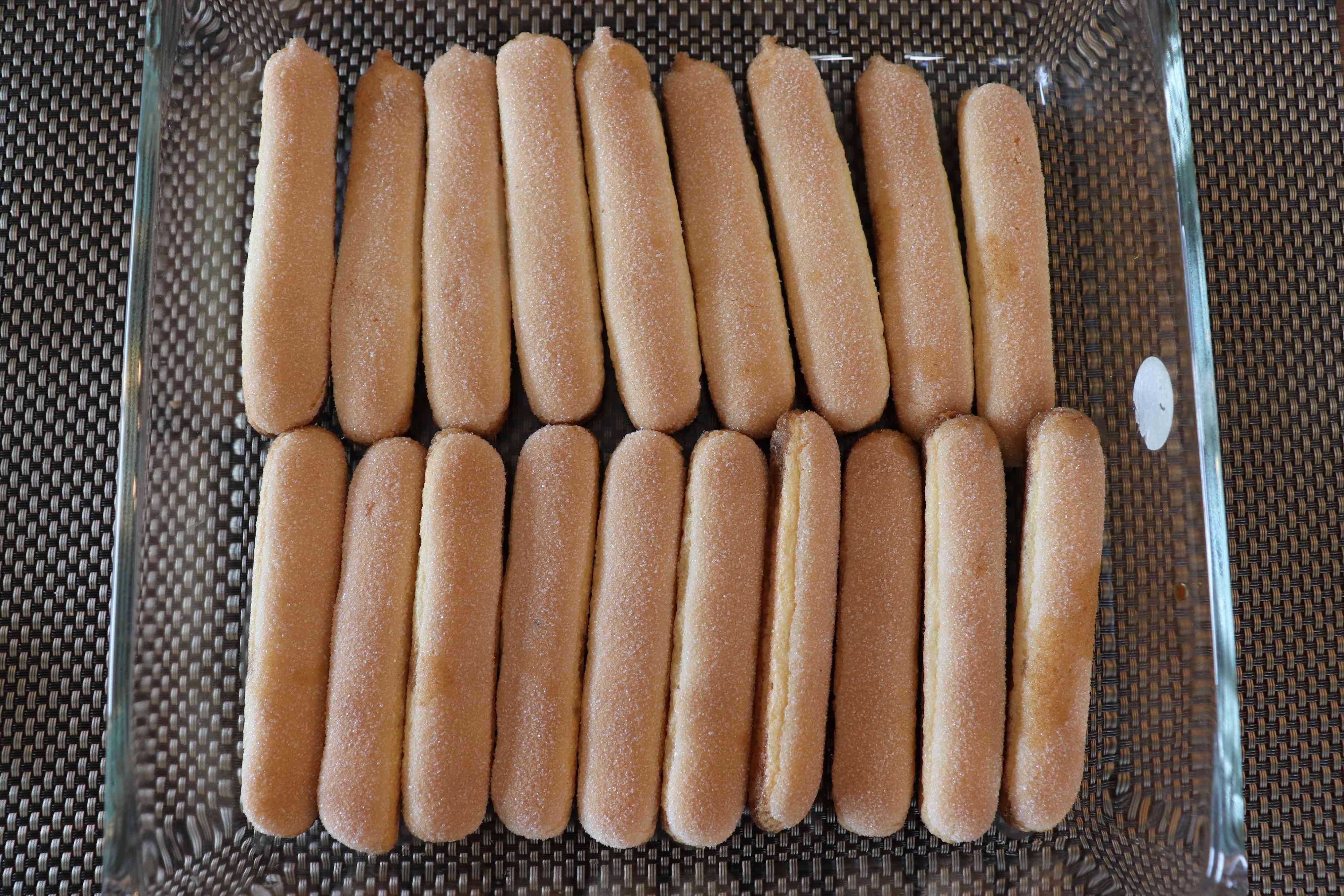 4.フィンガービスケットをエスプレッソに浸して、器に並べていく。