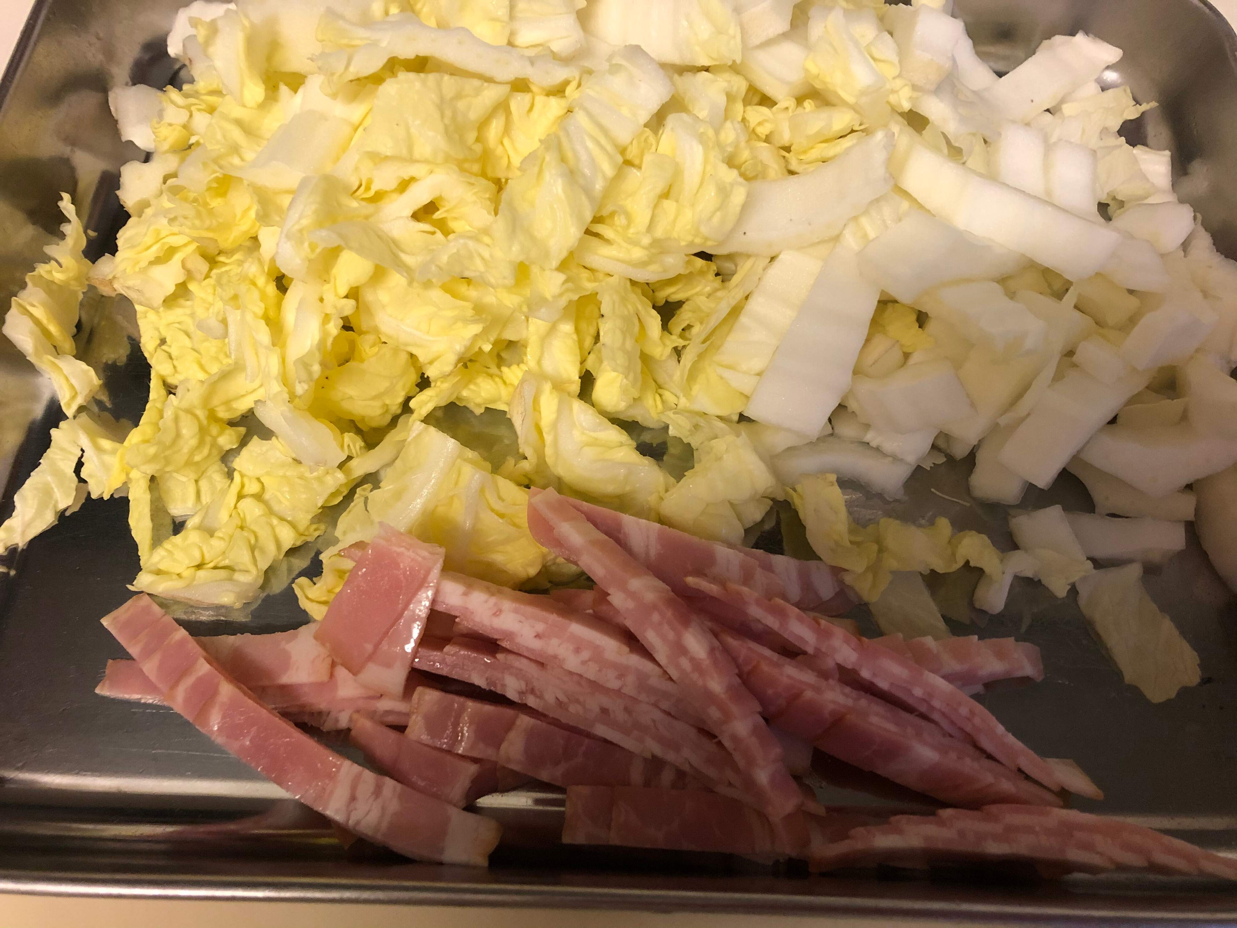 1の沸騰を待つ間、すかさず白菜とベーコンを細切りにする。
