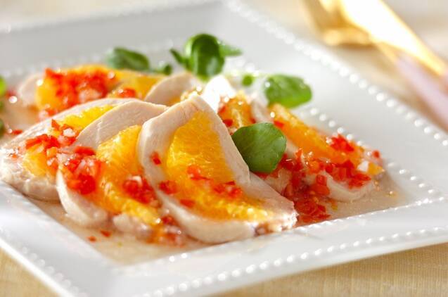 ハッサクを重ねることで、素朴な鶏ハムを彩り鮮やかに演出したサラダレシピ。プチトマトを使ったラビゴットソースが、ほどよい酸味と食感のハーモニーをプラスしてくれます。