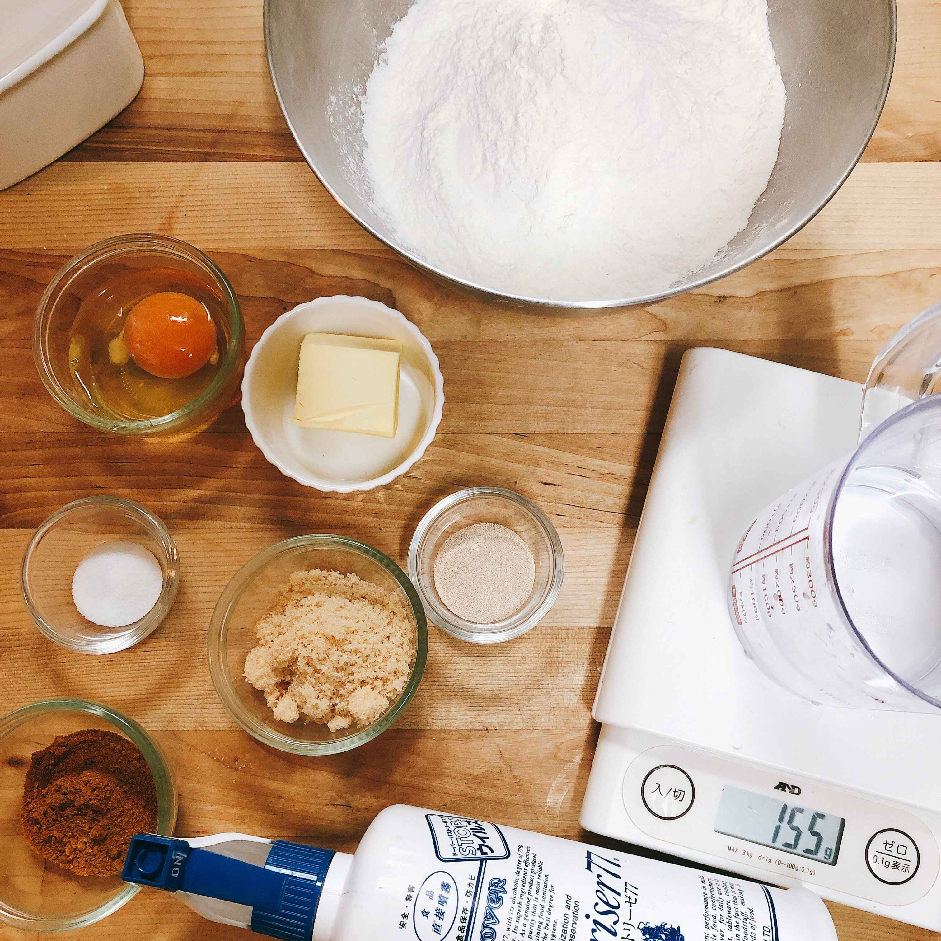 ⑴材料はしっかり計量します 一次発酵まではホームベーカリーを使うと簡単です。