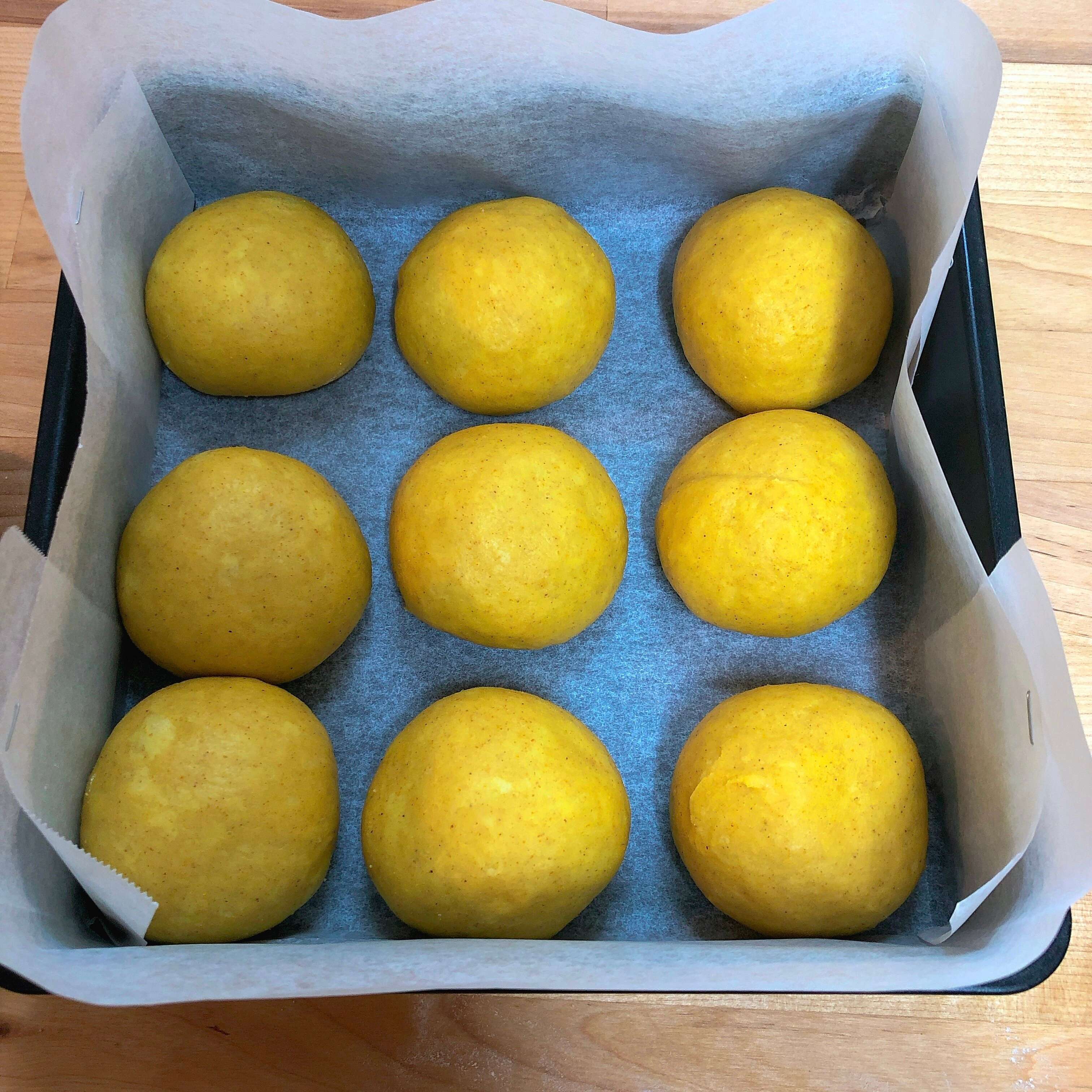 ⑶ 型の大きさに合わせて生地を等分して、丸めて濡れふきんをかけてベンチタイム15分。