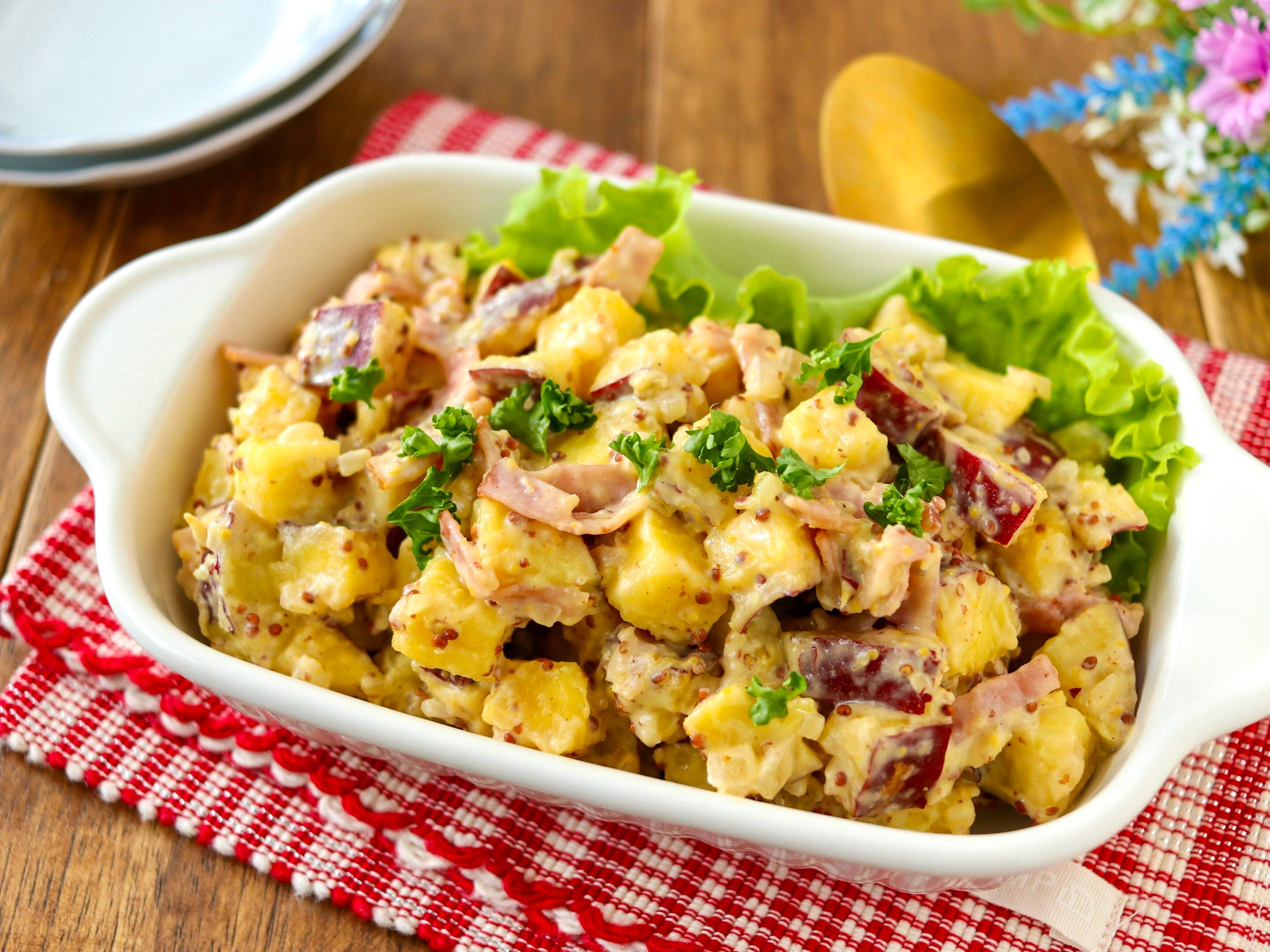 例えば、さつま芋をじゃがいもに変えて、ジャーマン風ハニマスサラダに。また、さつま芋の代わりにブロッコリーと卵を入れて、具だくさん卵サラダ風にも。