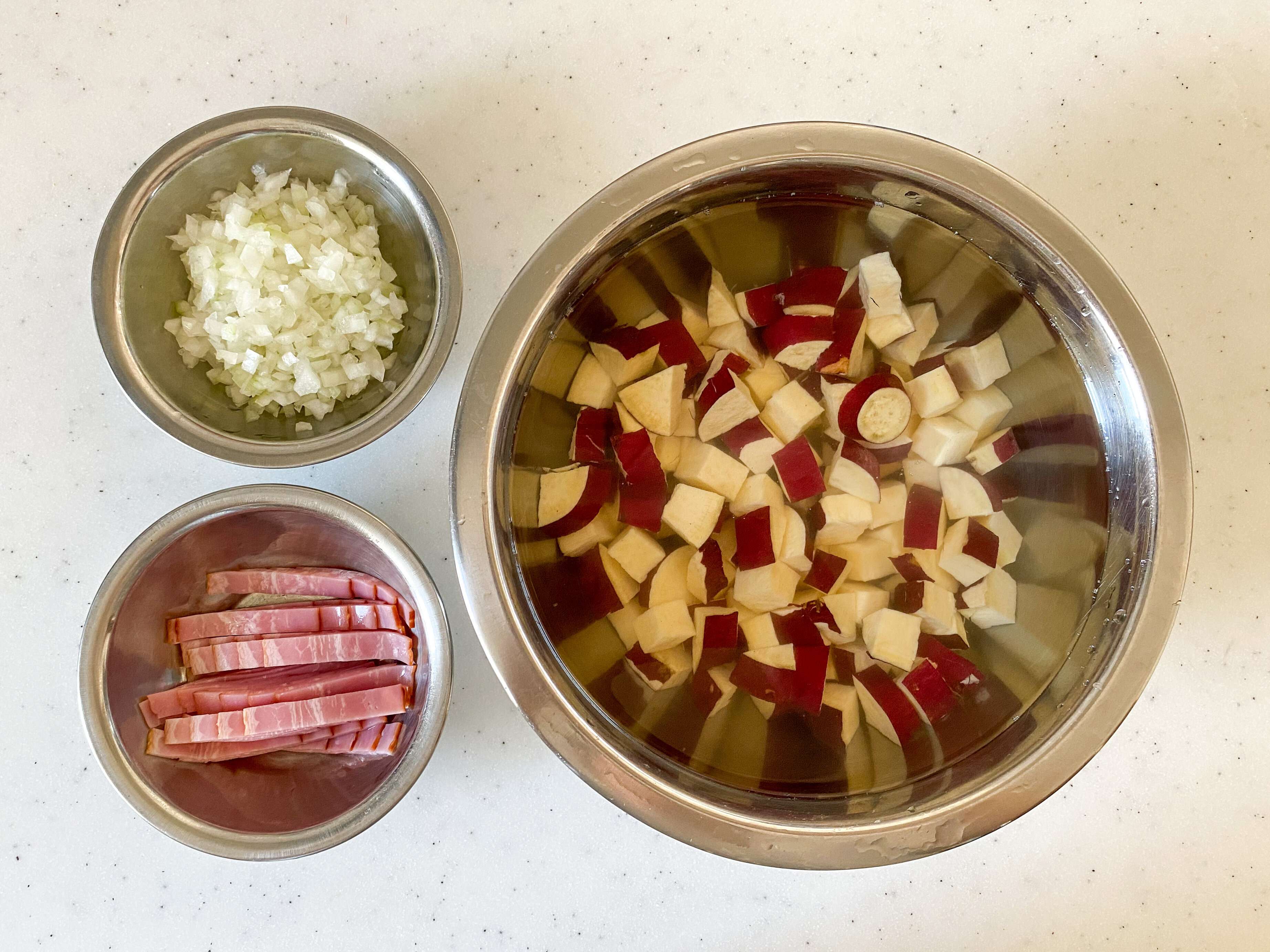 (1)さつま芋は1.2~1.5cmのダイスカットにし、水に約20分つける。ハーフベーコンは5mm幅に切り、玉ねぎはみじん切りにする。