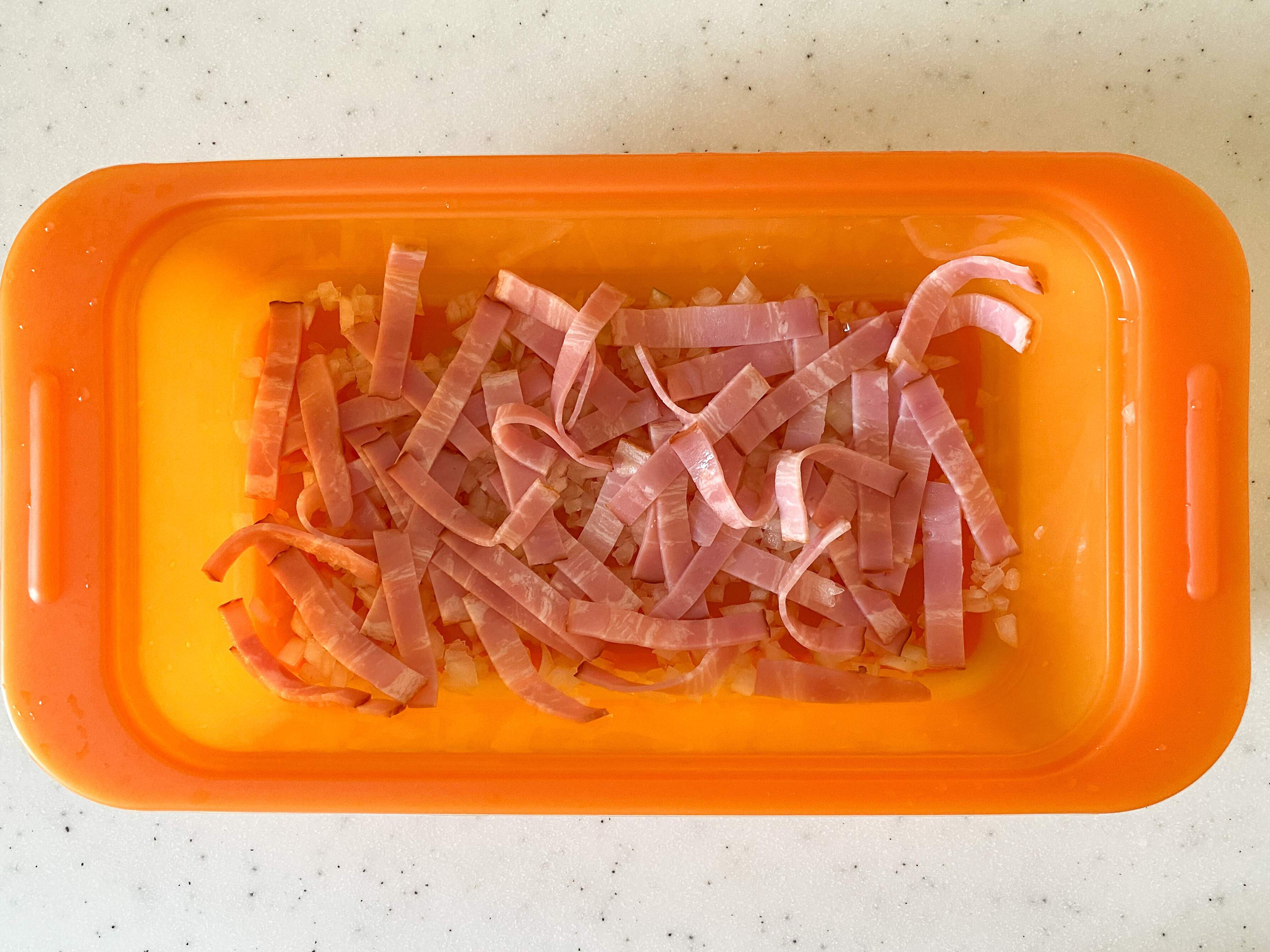 (2)耐熱容器に玉ねぎを広げて入れ、その上にベーコンをほぐしてのせる。フタをして600Wで2分レンジ加熱したら、混ぜてからボウルに取り出す。