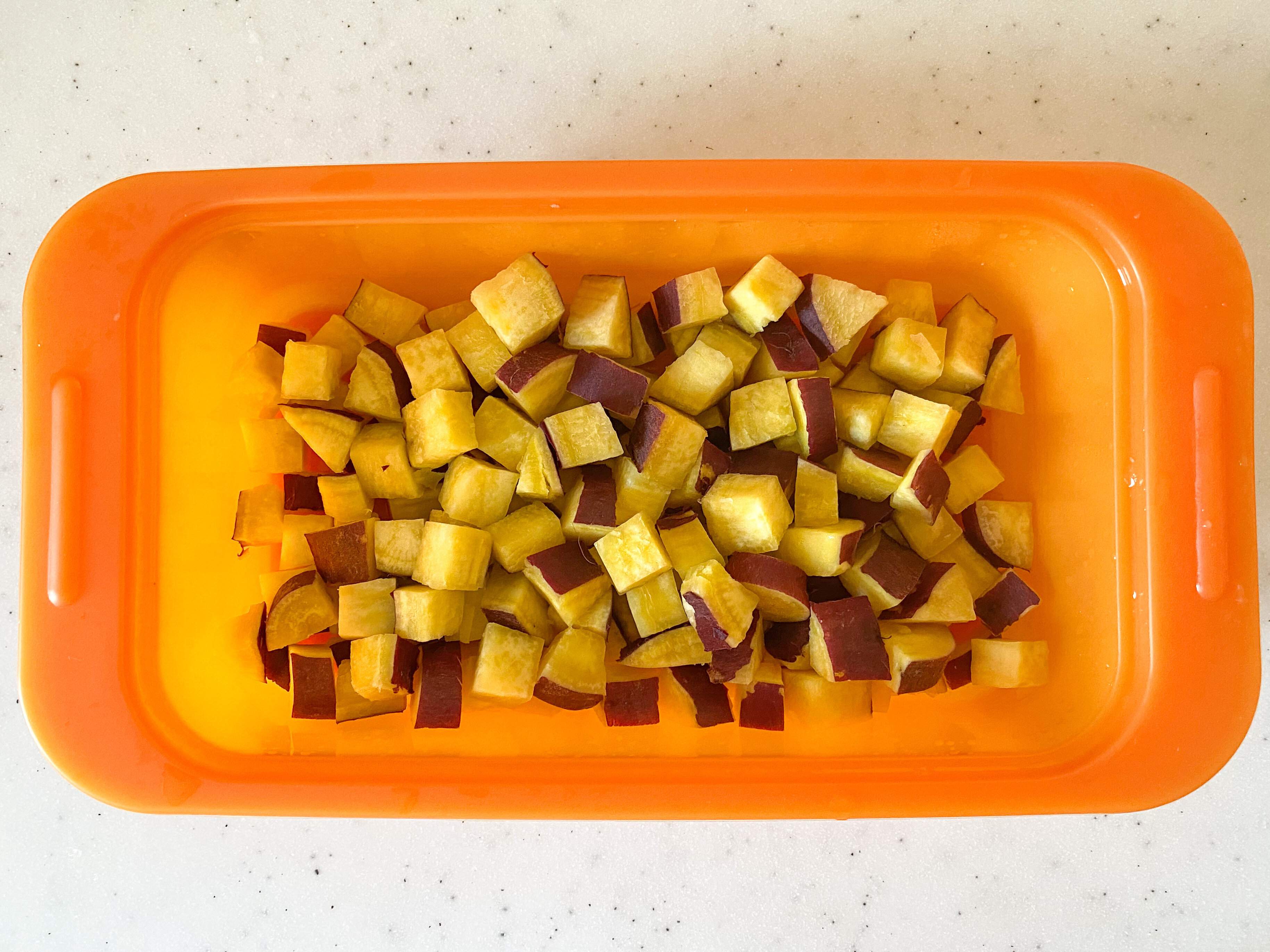 (3)さつま芋はザルにあげて水気を軽く切り、空いた(2)の耐熱容器に入れる。600Wで5分半レンジにかけ、途中3分ほどしたところで一度中身を混ぜる。