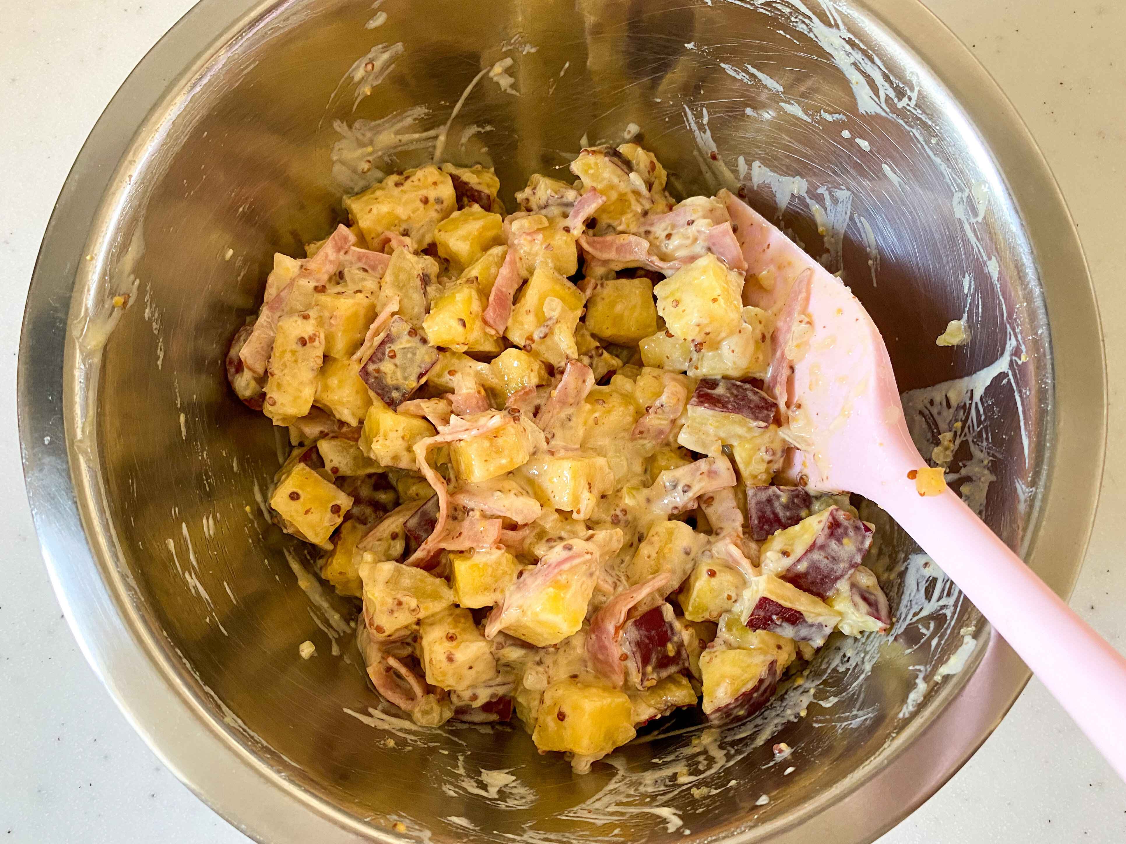 (4)ベーコンなどが入ったボウルに加熱したさつま芋をを加え、温かいうちにはちみつを入れてなじませる。その後で、マヨネーズ、粒マスタード、醤油を加えて混ぜ合わせる。