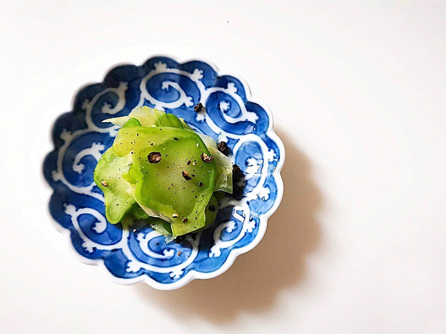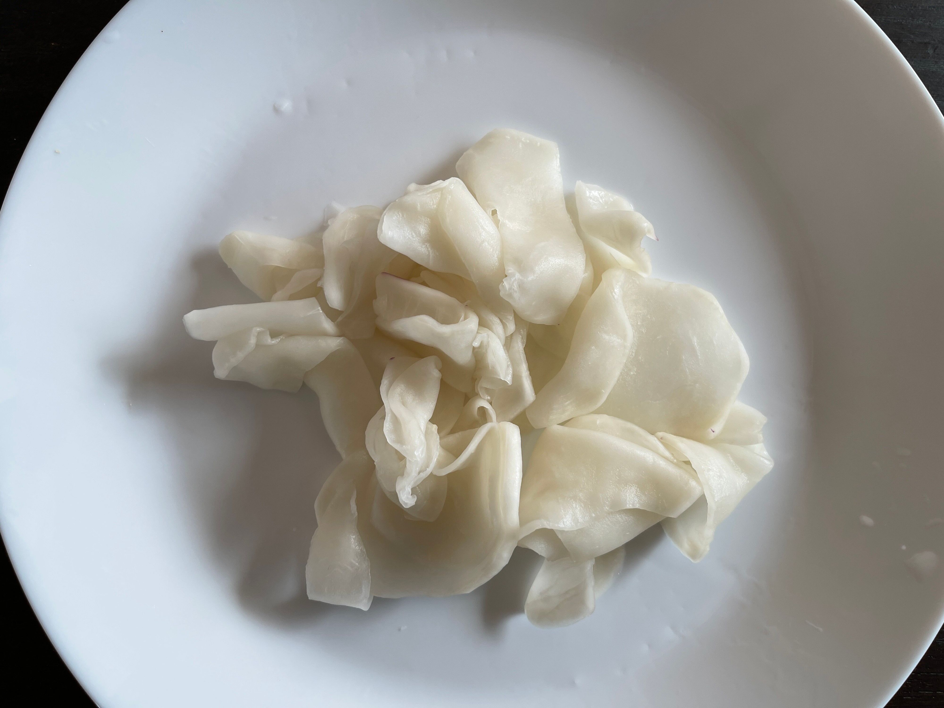 (1)カブは皮を剥いて薄切りにし、塩を揉みこんでしばらく置いておき、水気をよく絞る。