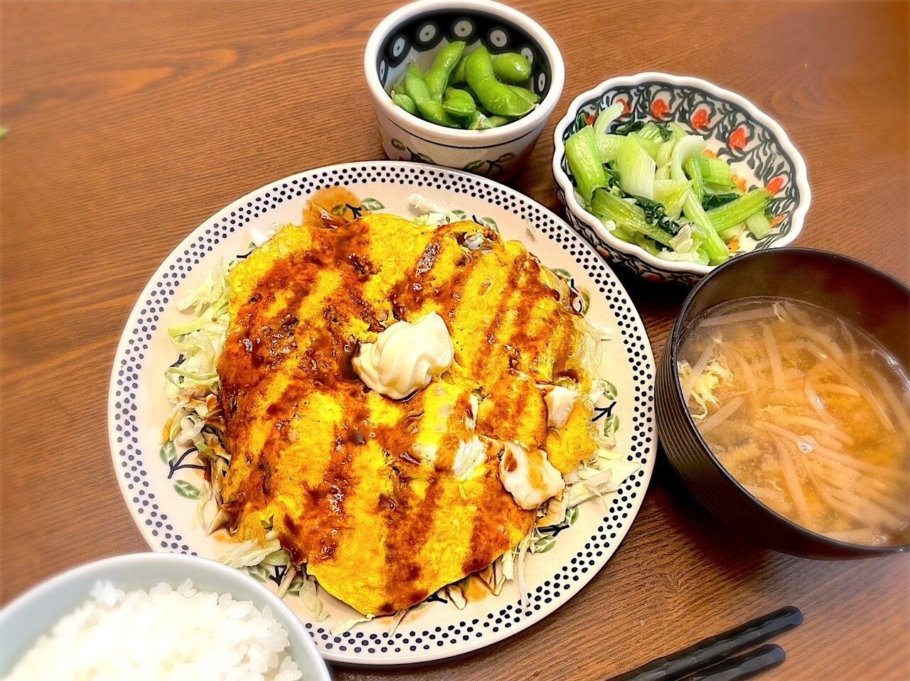 フライパンをキッチンペーパーで軽く拭き、とん平焼きを続けてつくります。豚肉を炒め火が通ったら溶き卵を入れてふたをし、卵に火が通ったら千切りキャベツの上にのせます。ソースとマヨネーズをかければできあがり! 冷凍枝豆は調理の間にチンしておきます。