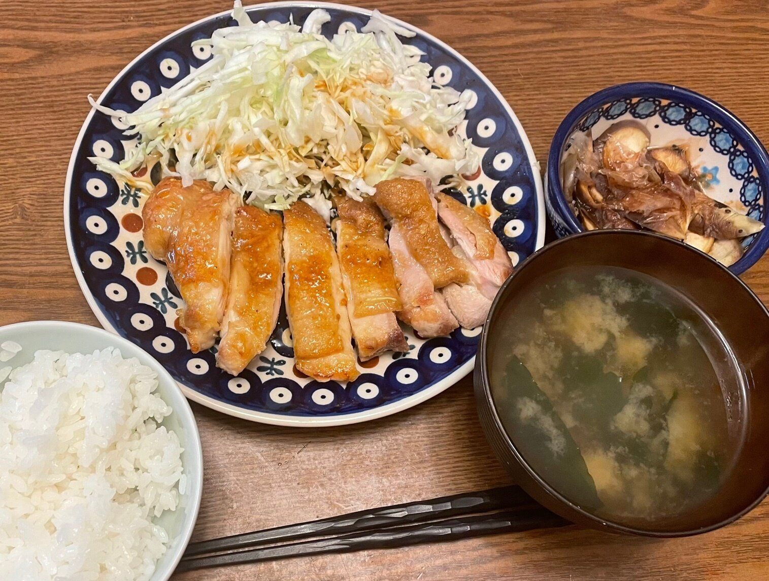 火曜日は、チキンソテーとレンチン蒸しナスです。キャベツは千切りにしてお皿に盛っておきます。鶏ももは焼き縮みを防ぐため、皮にフォークで穴を数カ所開けておき、厚みのある部分は包丁で切り目を入れて開いておきます。