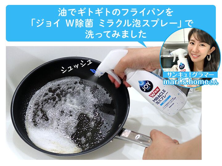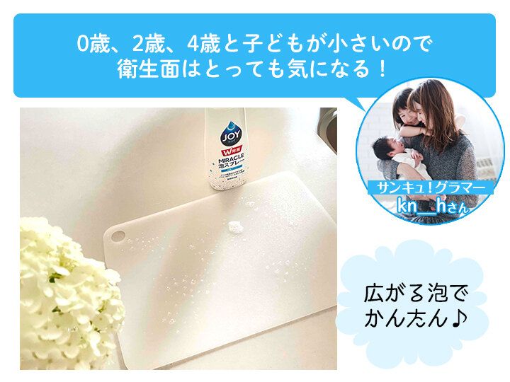 「『ジョイ W除菌ミラクル泡スプレー』は食器洗いに使った後、まな板全体にスプレーして約20分放置し、洗い流すだけ*²とラクちん! しかも泡がまんべんなく広がってすごくスムーズ。こんなに手軽ならこまめな除菌対策も苦になりません。これからわが家の必需品になりそうです」