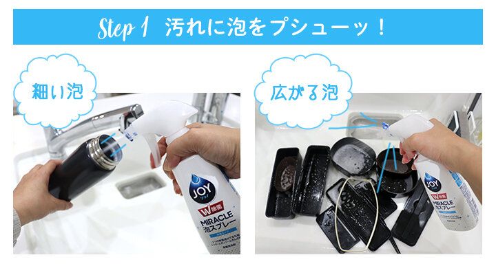「ジョイ W除菌ミラクル泡スプレー」は、細い泡と広がる泡で、水筒の底やお弁当箱、シンクなどに潜む菌の巣*⁴もラクラク除去! 夏もキッチンを手軽に、清潔に保てます。