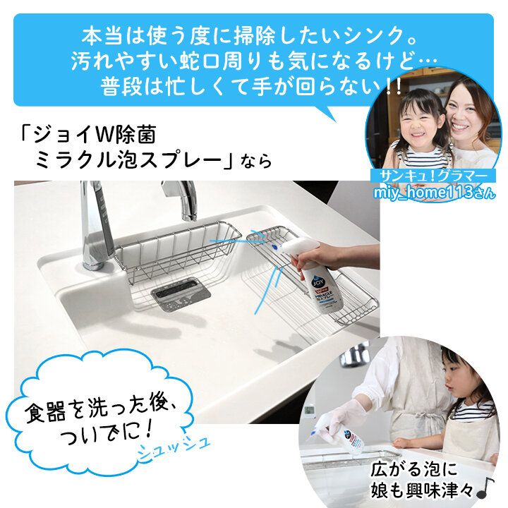 「これまではシンクを洗った後にアルコール除菌をしていましたが、『ジョイ W除菌ミラクル泡スプレー』は食器を洗った『ついで』にシンクの掃除と除菌*³ができるから、手間なくきれいな状態をキープできそう。