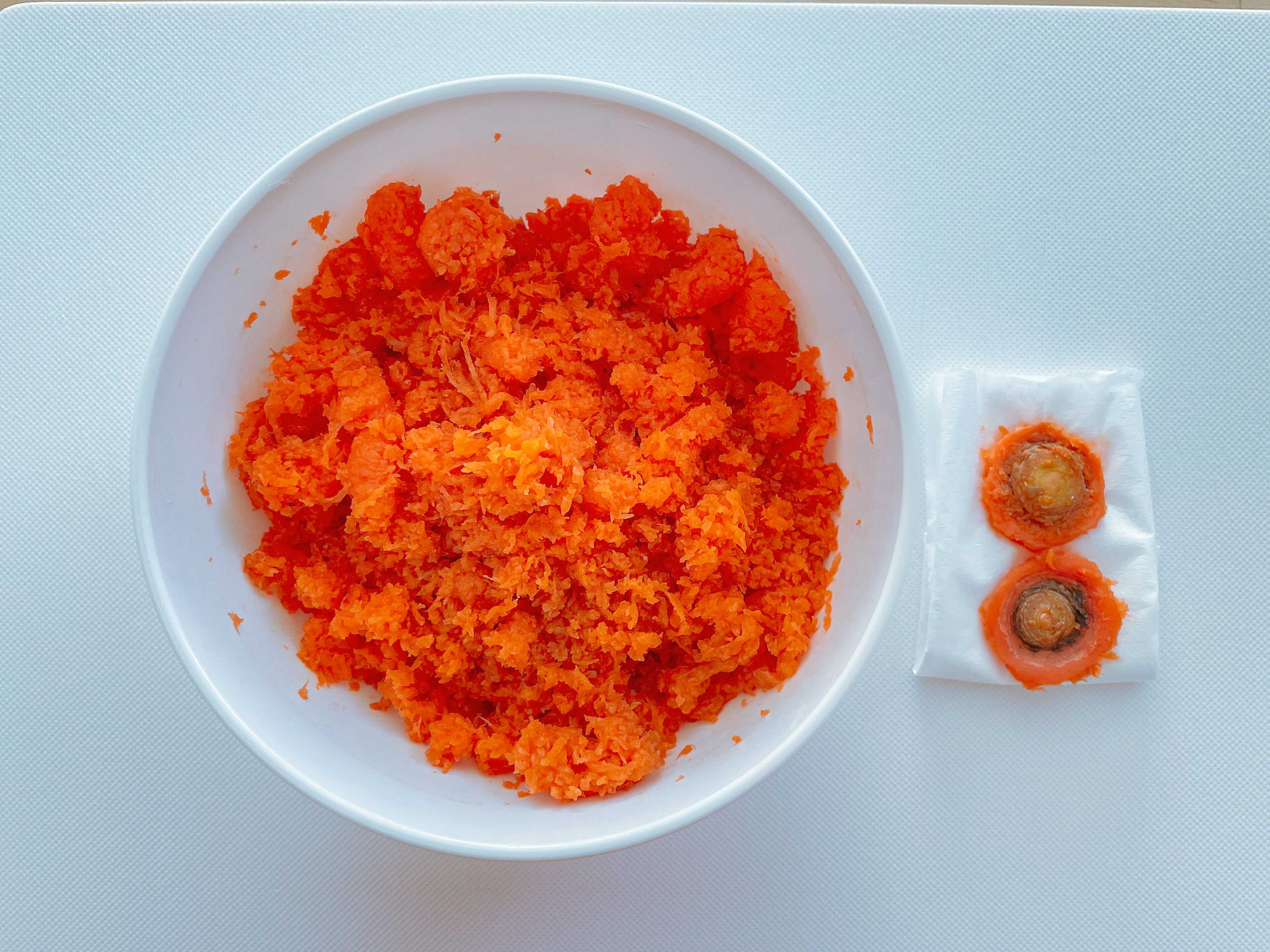 (1)にんじんは水洗いし、皮つきのまますりおろす。