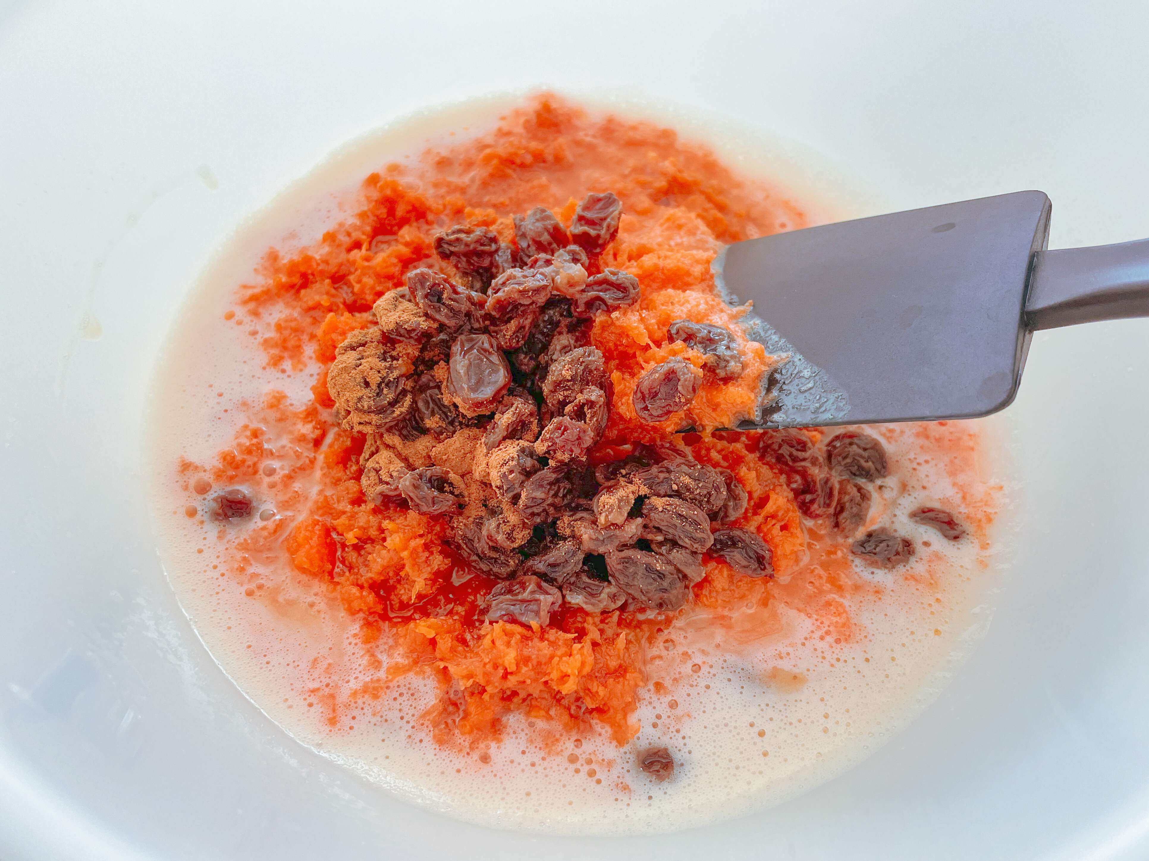 (2)ボウルの中で★をしっかり混ぜ、すりおろしたにんじん、レーズン、シナモンパウダーを加えて混ぜる。