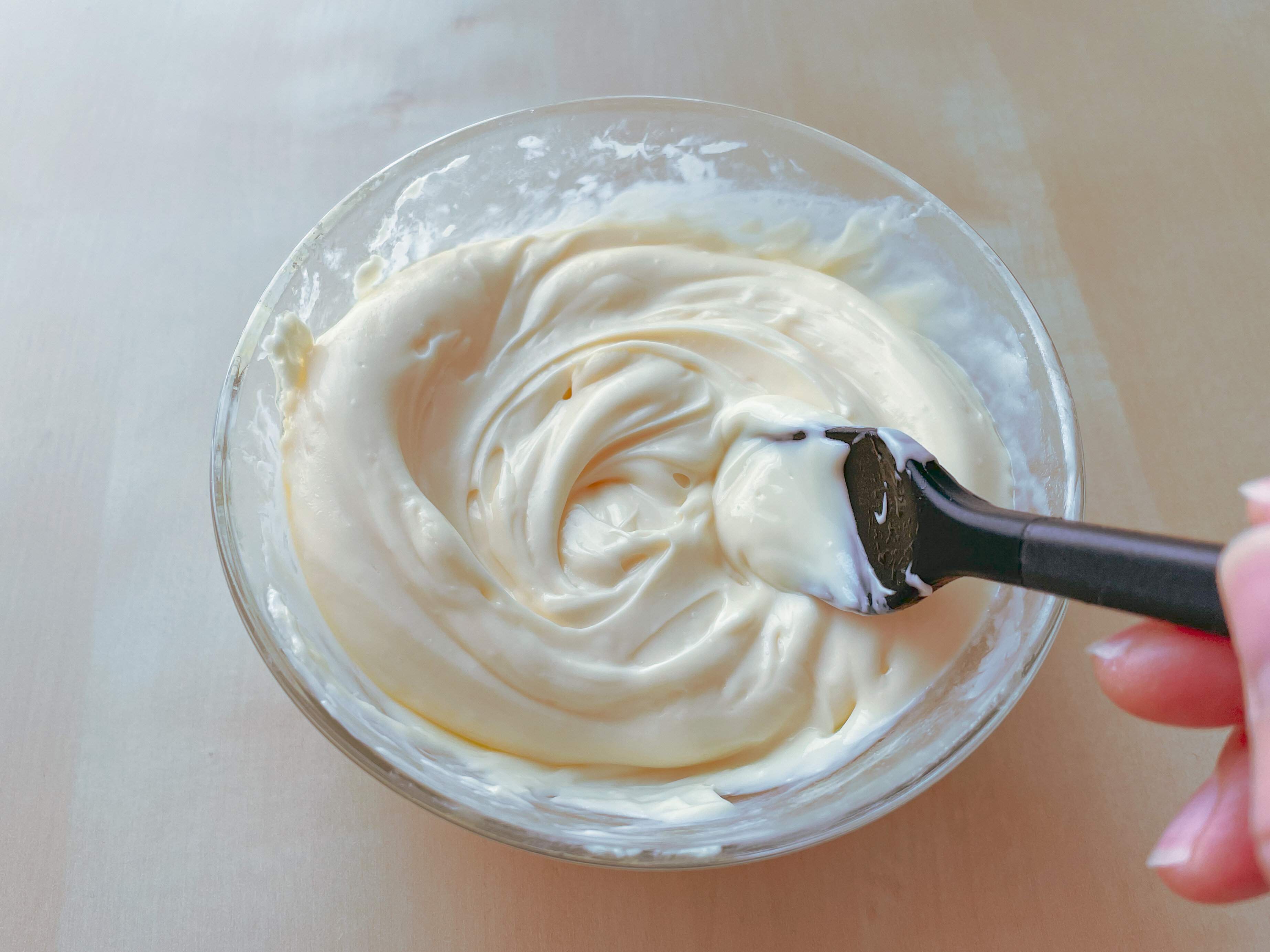 (8)チーズフロスティングの材料を耐熱容器に入れ、レンジで600W×30秒加熱し、なめらかになるように全体をよく混ぜる。