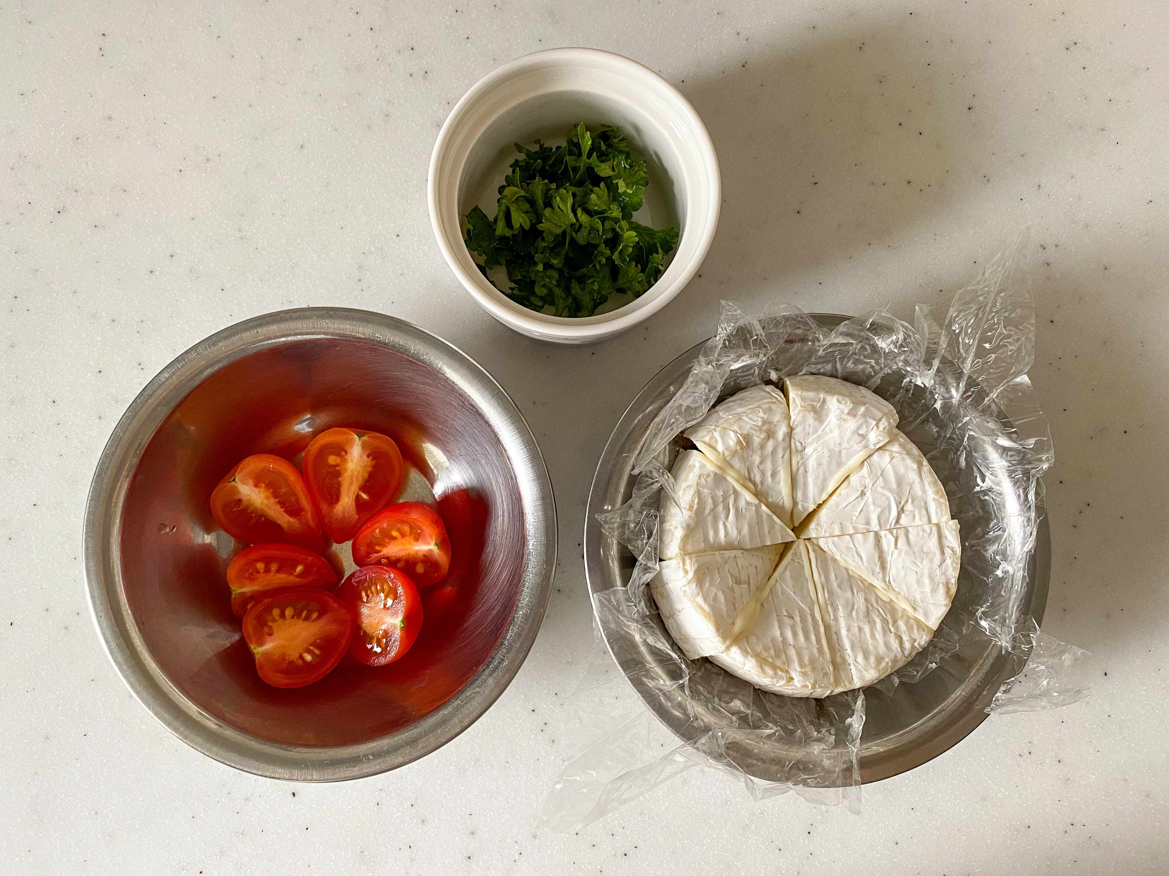 (1)カマンベールチーズは8等分に切る。ミニトマトは半分に、パセリは刻んでおく。ごはんは、冷やご飯や冷凍ご飯を使用する場合は、レンジにかけて温めておく。