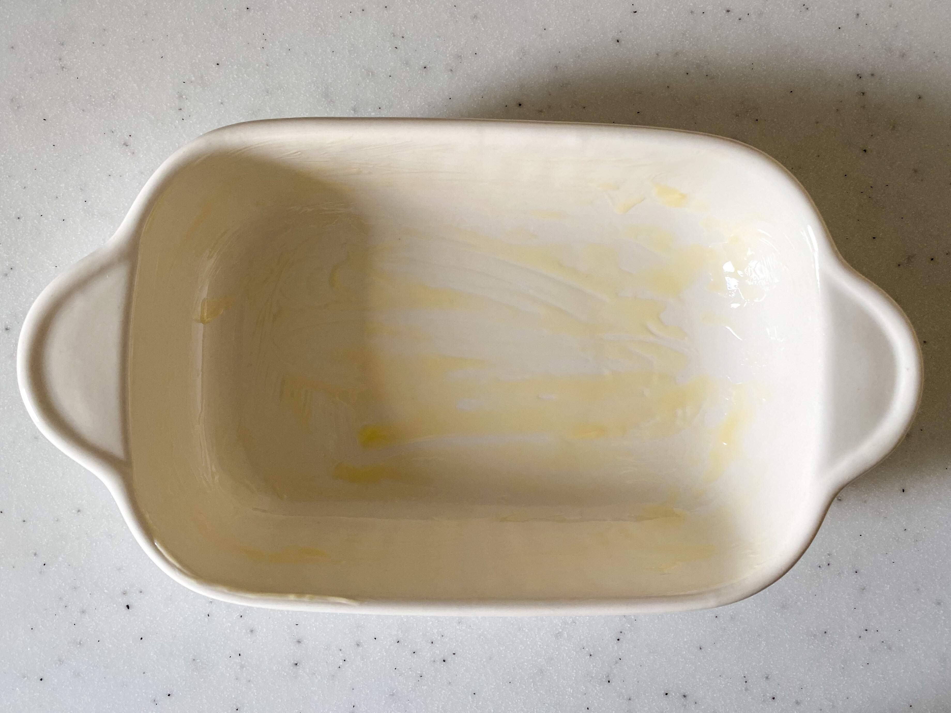 (2)2つのグラタン皿にバターを半量ずつのせ、600Wの電子レンジに20秒かける。バターが溶けたらグラタン皿の内側全体に塗る。
