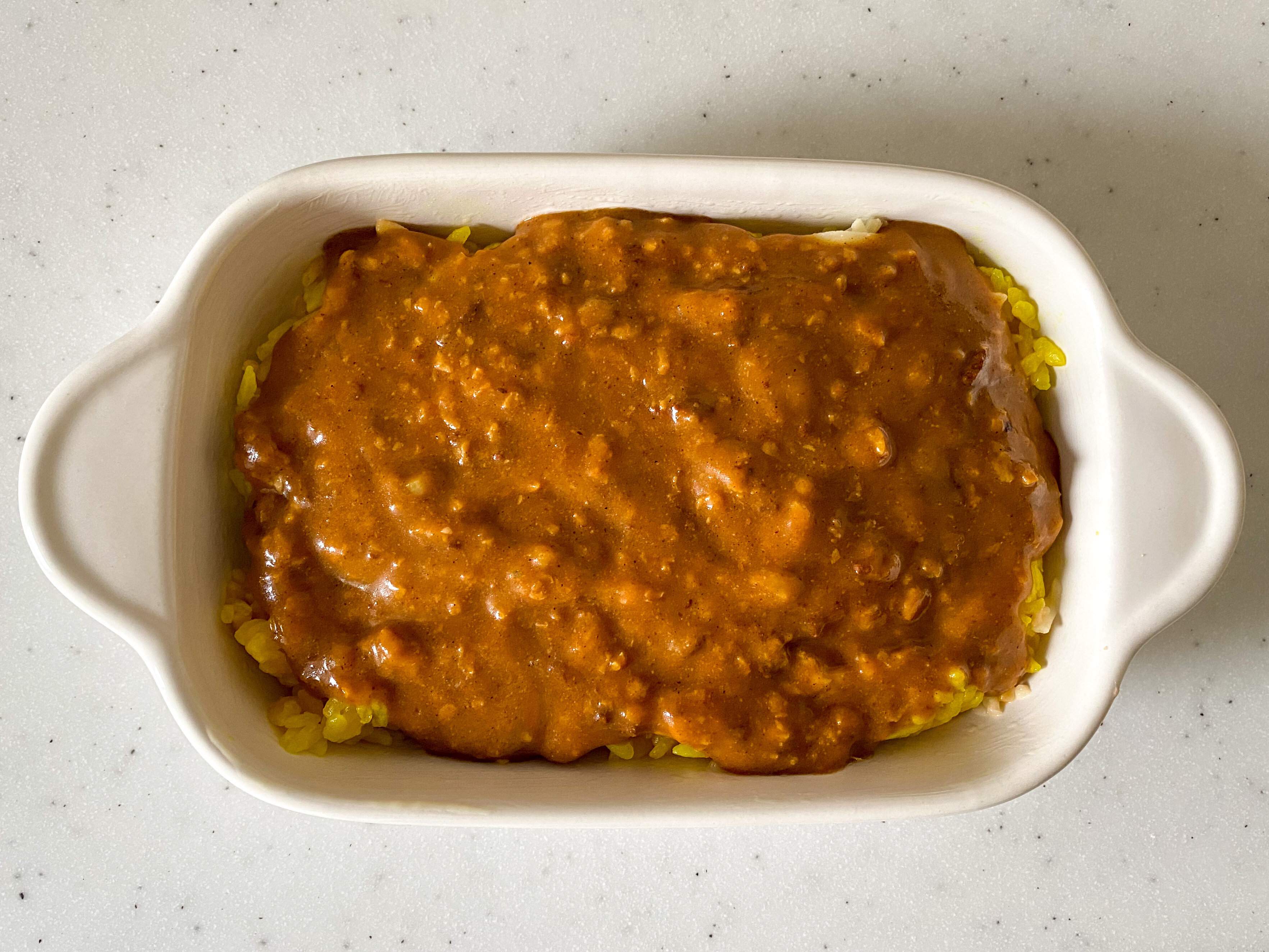 今回、たまたま冷凍庫にクミンライスが残っていたのでそれを使用していますが、ふだんは白ごはんで作っています。