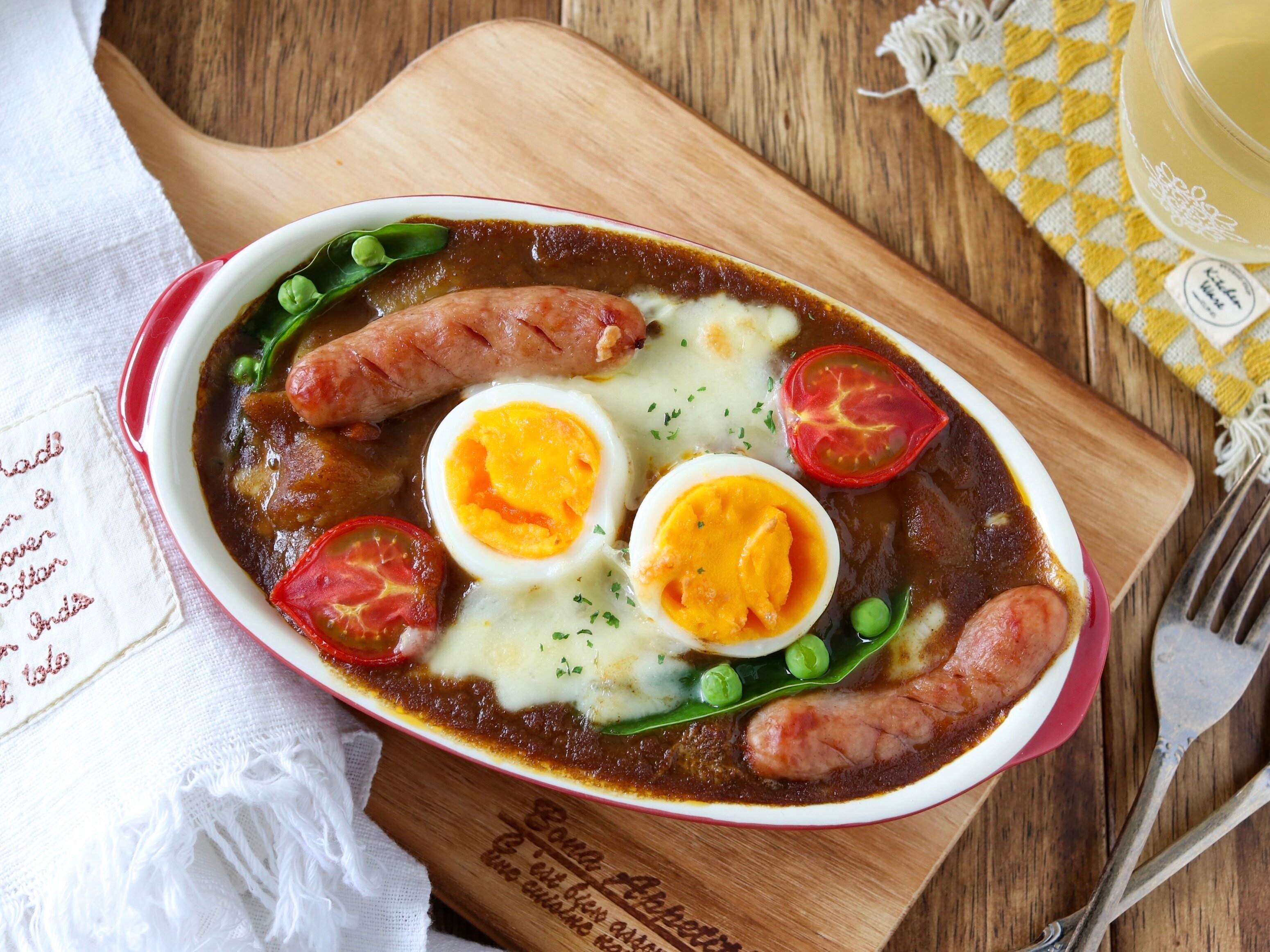 カマンベールチーズを使うとごちそう感がより一層プラスされますが、ちょっと節約したいな…というときは、ウインナーやゆで卵がオススメです!赤、黄、緑をバランスよく入れると彩りもよくなりますよ。