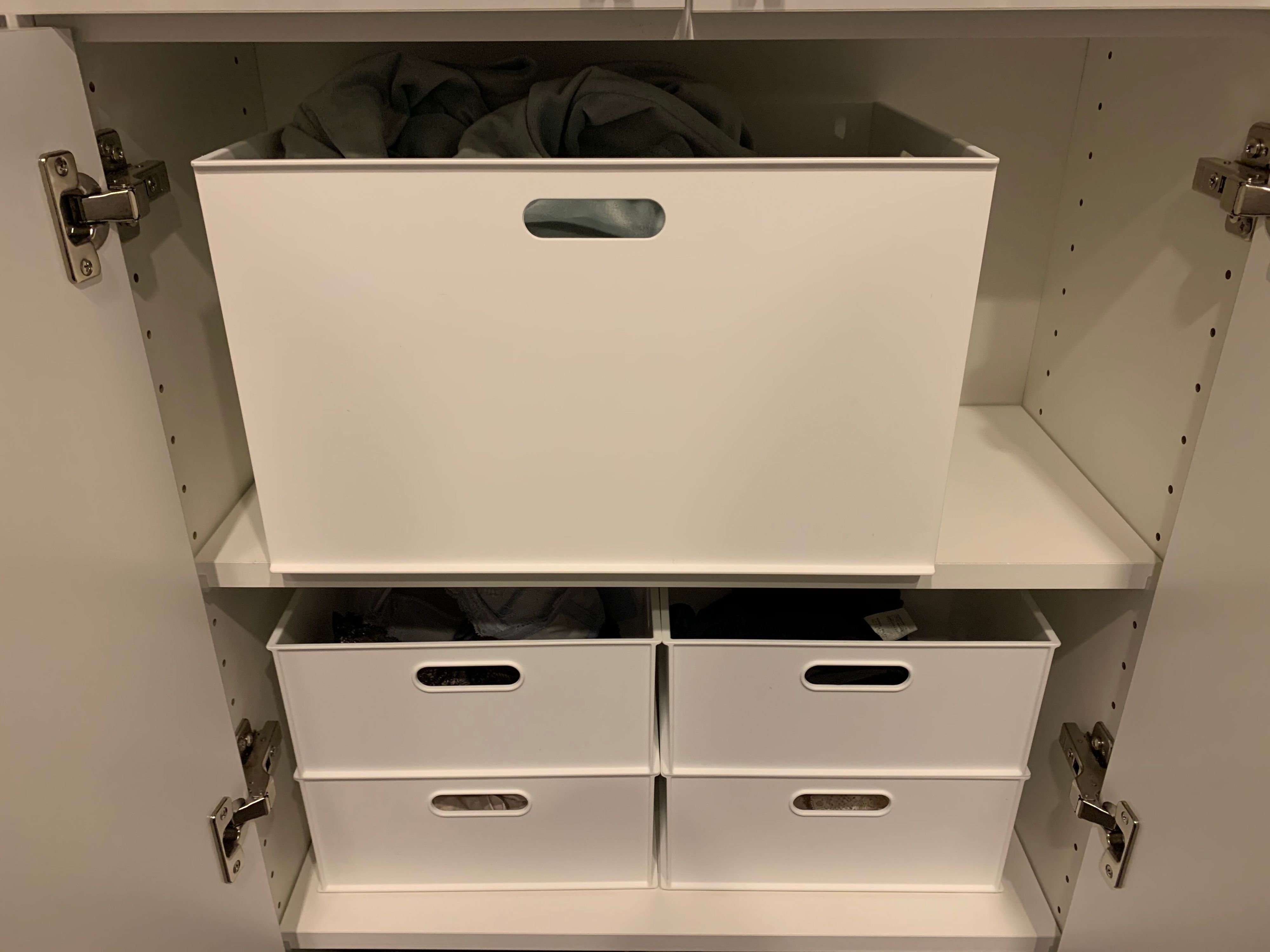 靴下は丸めて靴箱へ。パジャマや下着類は箱にポイっ。白い箱に収めれば畳まなくてもスッキリ。洋服は次着るときにちゃんと着れればいいと割り切りました。