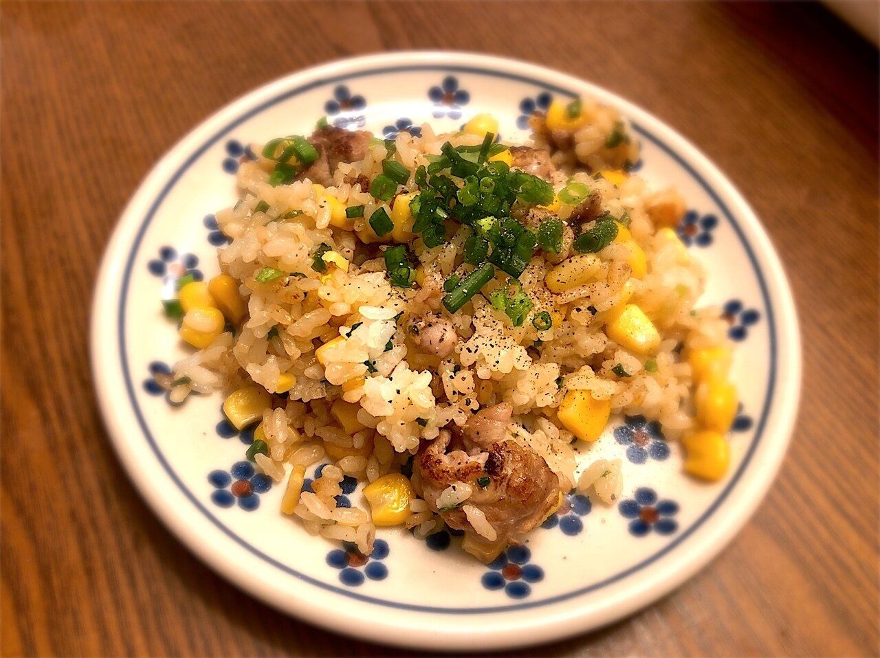 真ん中にご飯をのせ、さらにネギ、コーン、バターをのせて焼き肉のタレをぐるっとまわしかけます。