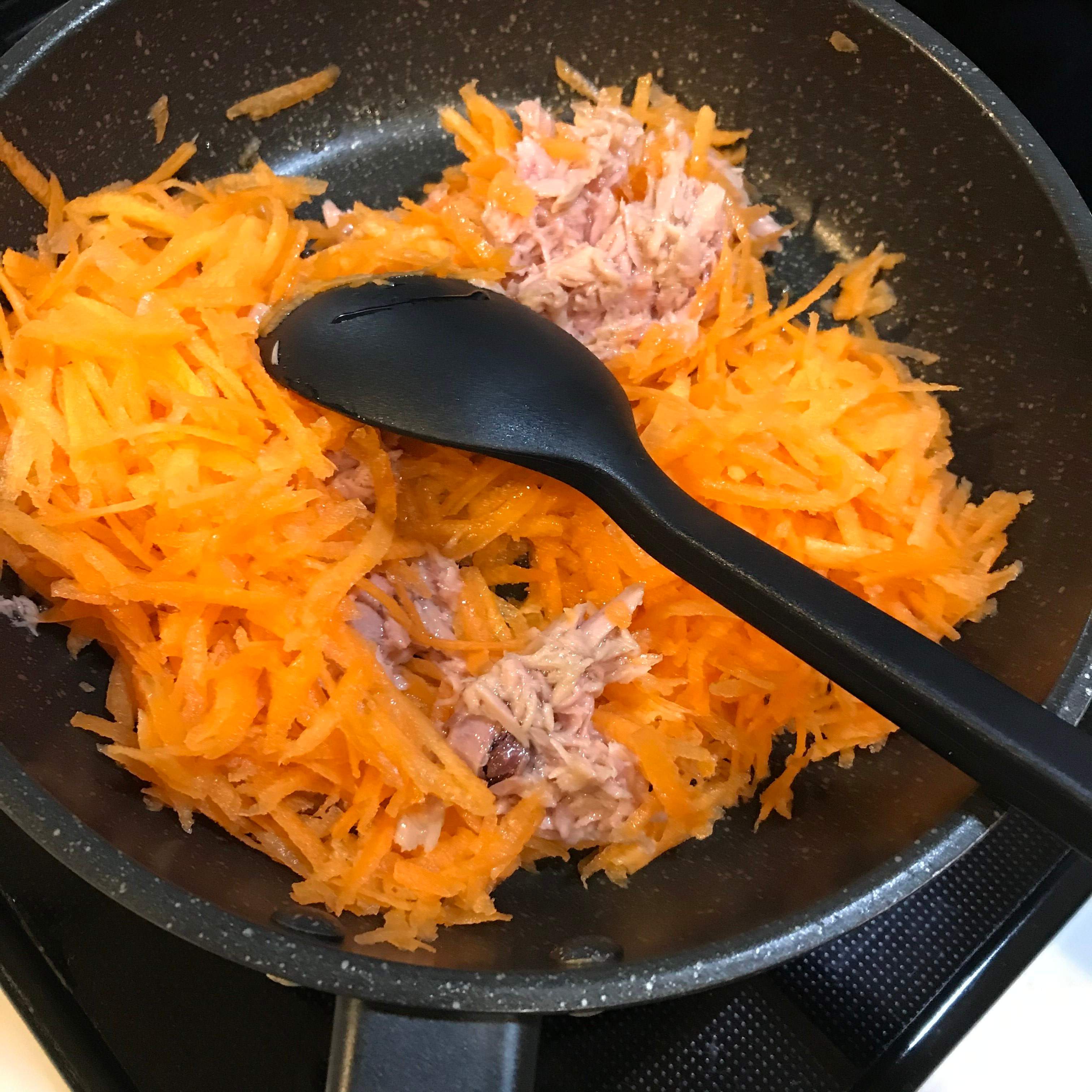 ▼フライパンに人参とツナ缶を油ごと入れて火にかけ、炒めはじめます。