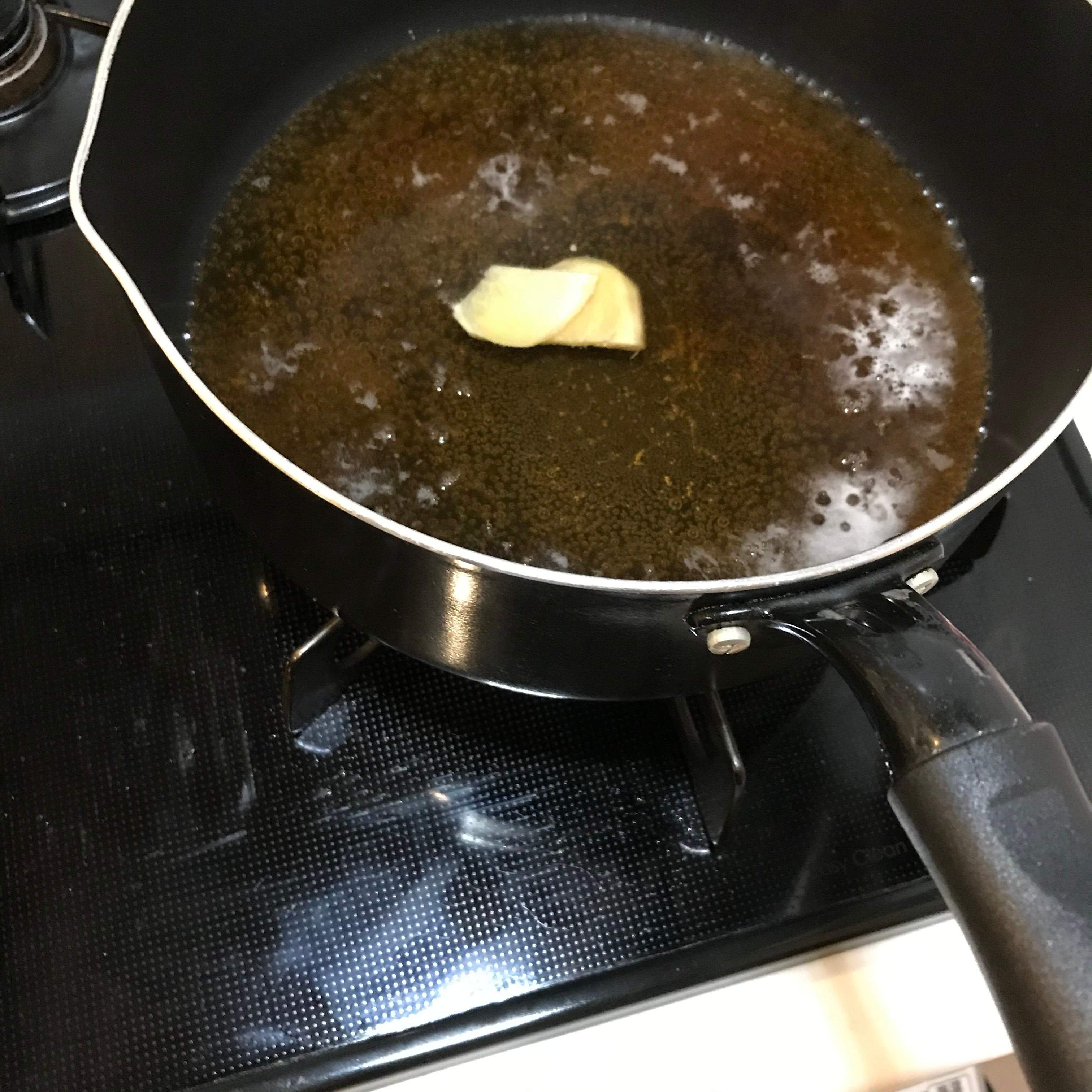 水、しょうゆ、みりんを煮立たせます。私はショウガが好きなので冷凍ストックしているショウガの薄切りも入れました。
